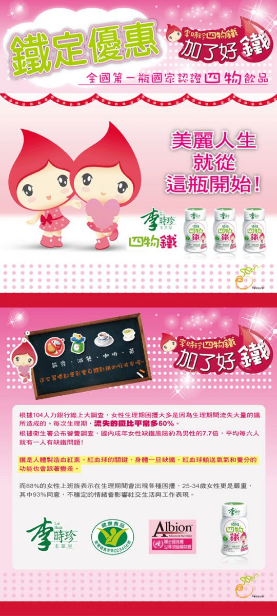 主原料:加味四物萃取液(含當歸、川芎、杓藥、熟地、桂圓、紅棗、枸杞)、甘胺酸亞鐵、大豆發酵物