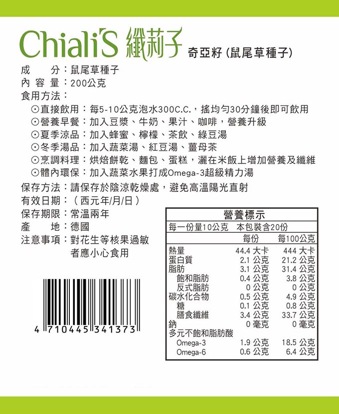 食用方法:每5-10公克泡水300C.C.,搖均勻30分鐘後即可飲用