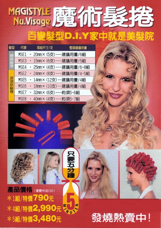 來自德國原裝進口的『魔術髮捲』適用於各種年齡層及各種髮質,能在最短時間內自我創造出快速的髮型。  	  	   	它的特殊材質及世界專利的表面結構,高品質可燃性的塑膠材質是由航太科技所研發的,即使髮捲在高溫煮沸中,仍可保持及加熱至45℃。  	  	   	使用很簡單,只要先將髮捲至水中加熱並且煮沸,利用夾子取出髮捲,將厚捲或螺絲捲捲在乾燥的頭髮上,每個髮捲勿上太多的頭髮(整個造型之上髮捲時間約需10分鐘),再讓它停留約5分鐘,此時上髮捲的頭髮會受熱並擴張。當它冷卻時,頭髮會變縮並定型。  	  	   	整個過程絕對不需使用燙髮劑,就像是替頭髮三溫暖一樣,可保護髮質,讓頭髮更厚實並散發絲緞般的光澤。  	  	   	您不用再擔心會傷害髮質及花大筆的費用在做頭髮上。  	  	   	產品有二種規格(售價一樣):  	  	   	大波浪~使用24mm(一組8支)  	  	   	螺絲捲~使用20mm(一組5支)  	  	   	每組皆附一支夾子  	  	   	整個頭髮造型所需組數:  	  	   	20mm(5支) 建議約需6組  	  	   	24mm(8支) 建議約需4~5組  	  	.jpg)