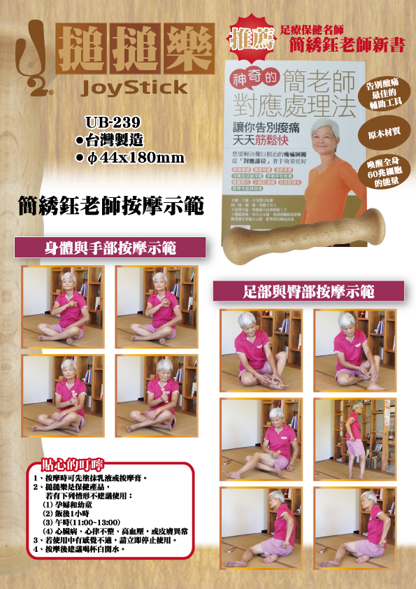 商品名稱:搥搥樂JoyStick 簡介: 搥搥樂是一款看起來簡單,卻有很多功能的按摩工具,透過工具的輔助按摩、搥打,來幫助紓壓,材質原木材質,體積輕巧方便攜帶,是居家、隨身必備健康良棒! 經絡:如同人體氣血運行的大小通道,遍佈全身。 按摩:正式一種以中國理論為基礎,經絡學說為輔助,透過各種按摩穴位和反射區的方法。 由足療保健名師 簡綉鈺與祐奇健康科技 共同研發。 商品規格: ■ 品名:搥搥樂JoyStick ■ 數量:1 ■ 材質/成份:原木材質 ■ 規格:顏色(原木色)/尺寸ø44x180mm ■ 認證:無 ■ 產地:台灣 ■ 保存方式:如需清潔,濕紙巾擦拭,自然風乾即可。 貼心的叮嚀 1.按摩時可先塗抹乳液或按摩膏。 2.刮刮樂是保健產品,若有下列情形不建議使用; (1)孕婦和幼童 (2)飯後1小時 (3)午時(11:00-13:00) (4)心臟病、心律不整、高血壓,或皮膚異常 3.若使用中有感覺不適,請立即停止使用。 4.按摩後建議喝杯白開水。 .jpg)