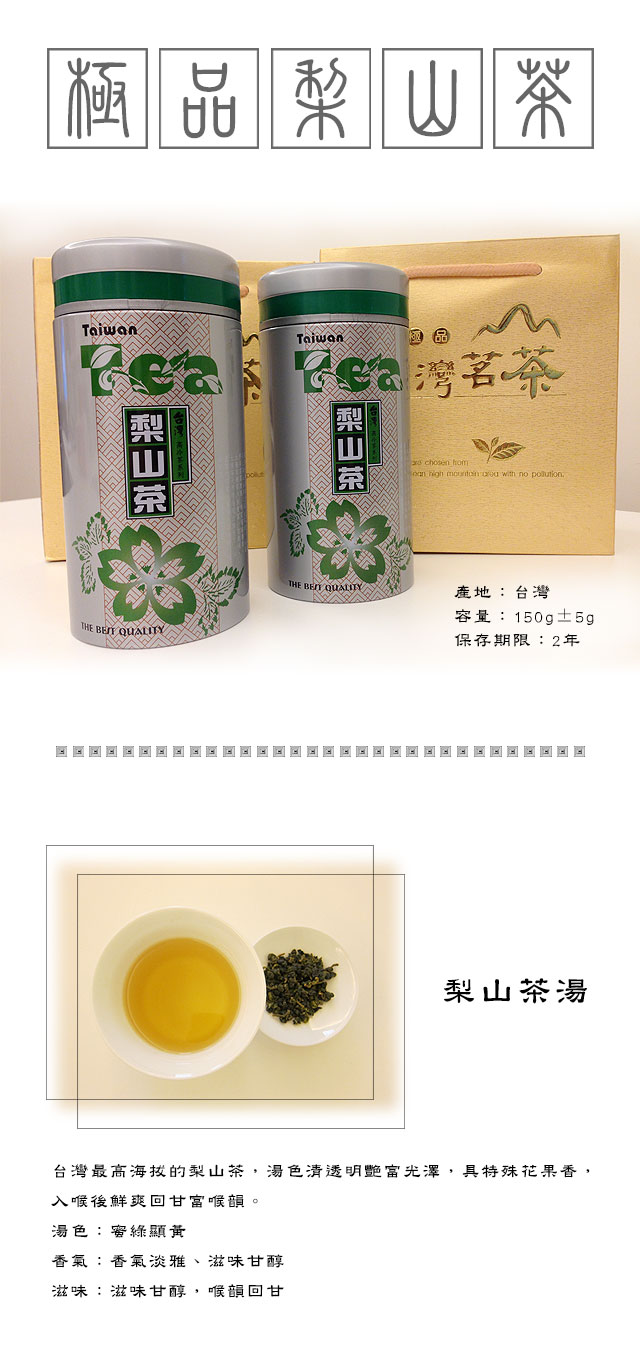 台灣最高海拔的梨山茶,湯色清透明艷富光澤,具特殊花果香,入喉後鮮爽回甘富喉韻。湯色:蜜綠顯黃