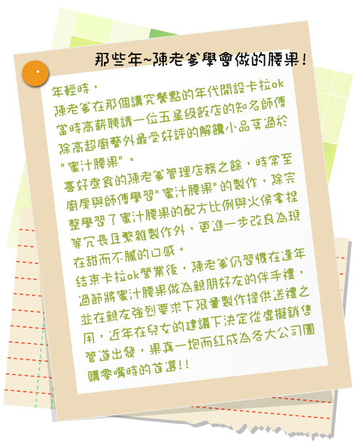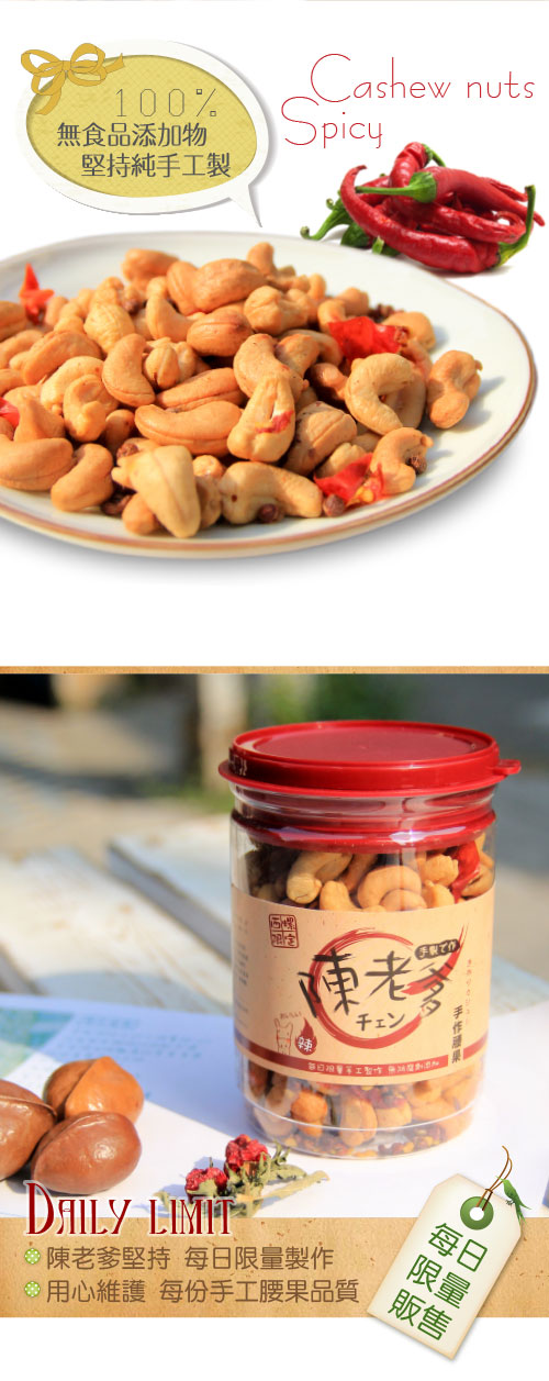 喜好煮食的陳老爹管理店務之餘,時常至廚房與師傅學習"蜜汁腰果"的製作,除完整學習了蜜汁腰果的配方比例與火侯拿捏等冗長且繁雜製作流程外,更進一步將蜜汁腰果口味,改良成現在甜而不膩的口味。近年在兒女的建議下決定從虛擬銷售管道出發,果真一炮而紅,短短兩三年時間亦承蒙媒體肯定獲得許多報導,並成為各大公司團購零嘴時的首選!!