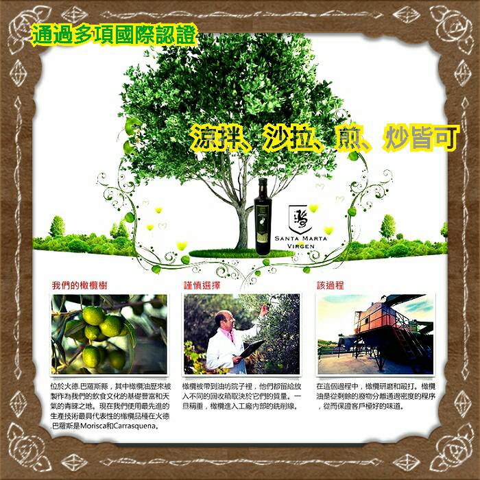 今年最令人放心食用的~頂級橄欖油!! 驚喜3瓶組(免運費) 聖瑪爾塔頂級橄欖油成份-有機冷壓初榨橄欖油 產地-西班牙原裝進口 保存期限-2年 商品規格-750ml瓶/*3瓶 ※適合用途-中、西式拌炒;涼拌...等等