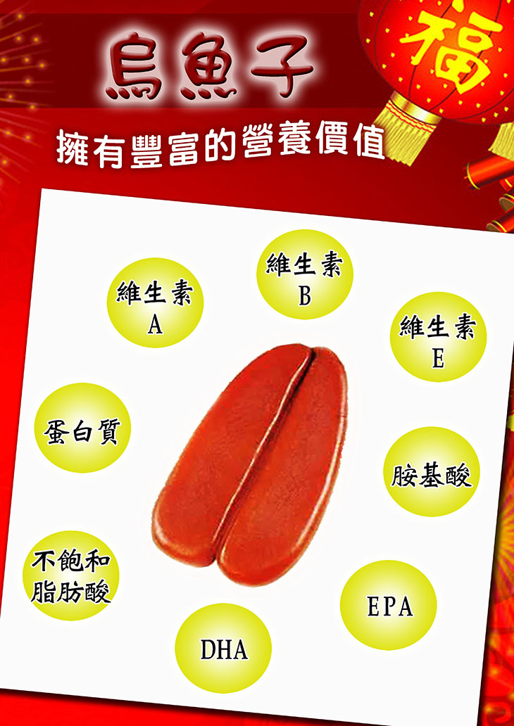 台灣人氣~烏魚子名牌口福-【烏魚伯】-5兩小康送禮組 5兩±5%(187.5g±5%/片)/片*3片/組 規格:烏魚子5兩±5%(187.5公克±5%)/片X3片/組(附精裝手提小禮盒) 有效期限:12個月 保存方式:-18度C冷凍保存 使用(食用)方法: 1.烏魚子用一些油,不用油也可以。 2.直接放入炒鍋中以小火烘烤時要壓一壓約3-5分鐘。 3.切片到盤中,再加上蒜苗、白蘿蔔、蘋果片一同食用。 4.烏魚子放入高梁酒中浸泡30秒後,在拿起來擦乾.在放入烤箱約3~5分鐘即可食用。 5.未用完的烏魚子.請包裝好放入冷凍。 口福烏魚子〞口感綿、密、Q、彈牙,完全無使用化學添加劑。 口福野生烏魚子:不管是形狀、色澤、形狀、質感、口感與品質都在其他烏魚子之上,吸收天地精華的烏魚這就是野生烏魚子魅力與好吃的所在,但因為其產量量少以及加工前的捕捉需要大量的人力與運氣,這也是為什麼野生烏魚子特別美味的原因,當那種天然濃郁味道在口中化開得滋味後,相信您一定會讚不絕口。烏魚子含有豐富蛋白質及脂質,而蛋白質所含之各種必需胺基酸都很好,脂質含多量高度不飽和脂肪酸如EPA與DHA。