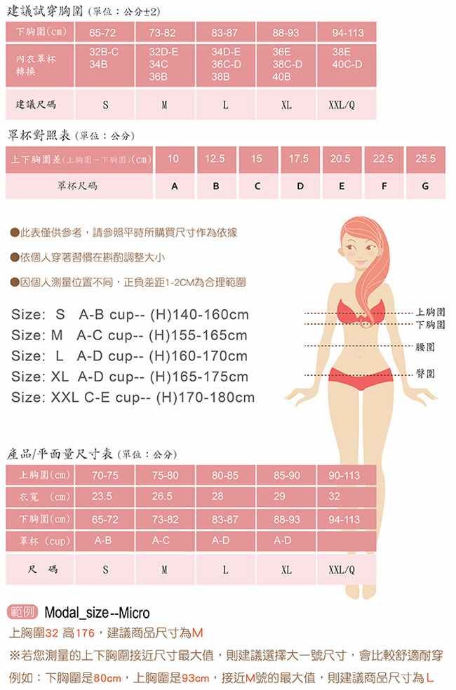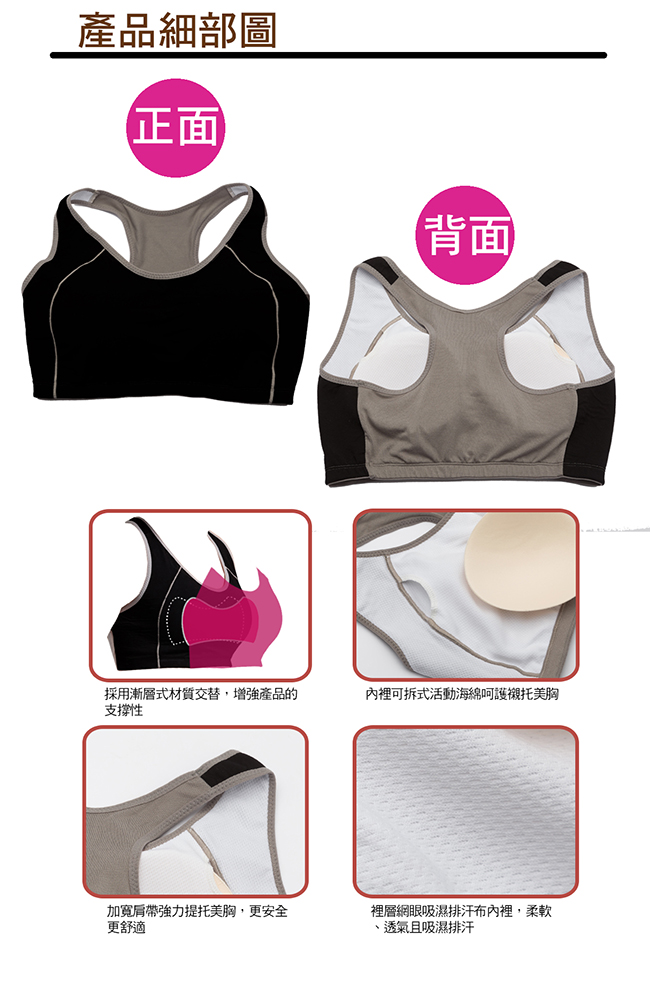 內容物品:運動內衣*2 (/黑+紫*1 /黑+米*1/紫+白*1) 襯墊: (有襯墊口袋;附襯墊一副) 厚度:1cm 肩帶:不可拆 材質: 表布FABRIC:莫代爾棉MicroModal 50%、聚酯纖維POLYESTER 42%、彈性纖維SPANDEX 8% 裡布 LINING:聚酯纖維POLYESTER 100% 顏色:黑色/紫色/米色 尺寸:S / M / L /XL /XXL 產地:台灣 洗滌方式: 1.請用中性洗潔劑手洗。 2.請用溫水手洗(請深淺色衣服分開洗滌) 3.不建議烘乾熨燙。 4.洗淨後請輕扭整型後倒掛夾在衣架晾乾。 注意事項 如商品本身有暇疵問題,請於貨到7日內來電客服中心辦理退換貨服務。 因商品屬個人衛生用品,請著貼身衣物再試穿唷! 所有商品均為新品,如有拆標、下水、污損、短缺,恕不接受退換貨。 辦理商品退換貨時,商品如有贈品或配件,麻煩請一併寄回,否則視同缺件無法受理喔!