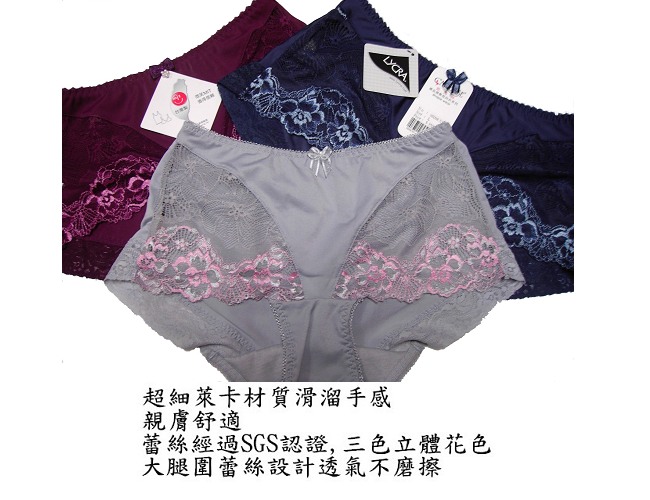本商品規格 內容:內褲x3 顏色:粉灰/紫紅/寶藍 彈性:超細萊卡 尺吋:M / L / XL 產地:台灣 材質:蕾絲表層:87% TACTEL +13% OP 裡層:65%彈性纖維+ 35% 綿 背片 :20%彈性纖維+80%NYLON 建議消費者穿著對照尺寸 (M 適合腰圍 23"-26") (L 適合腰圍 26"-29") (XL適合腰圍 29"-34") 胸罩: 32/A/B/C/D/E 34/A/B/C/D/E 搭配M內褲 胸罩: 36/A/B/C/D/E 搭配L內褲 胸罩: 38/B/C/D/E 40/C/D/E 搭配XL內褲 洗滌方式: 1.請用中性洗潔劑手洗。 2.請用溫水手洗(請深淺色衣服分開洗滌) 3.不建議烘乾熨燙。 4.洗淨後請輕扭整型後倒掛夾在衣架晾乾。
