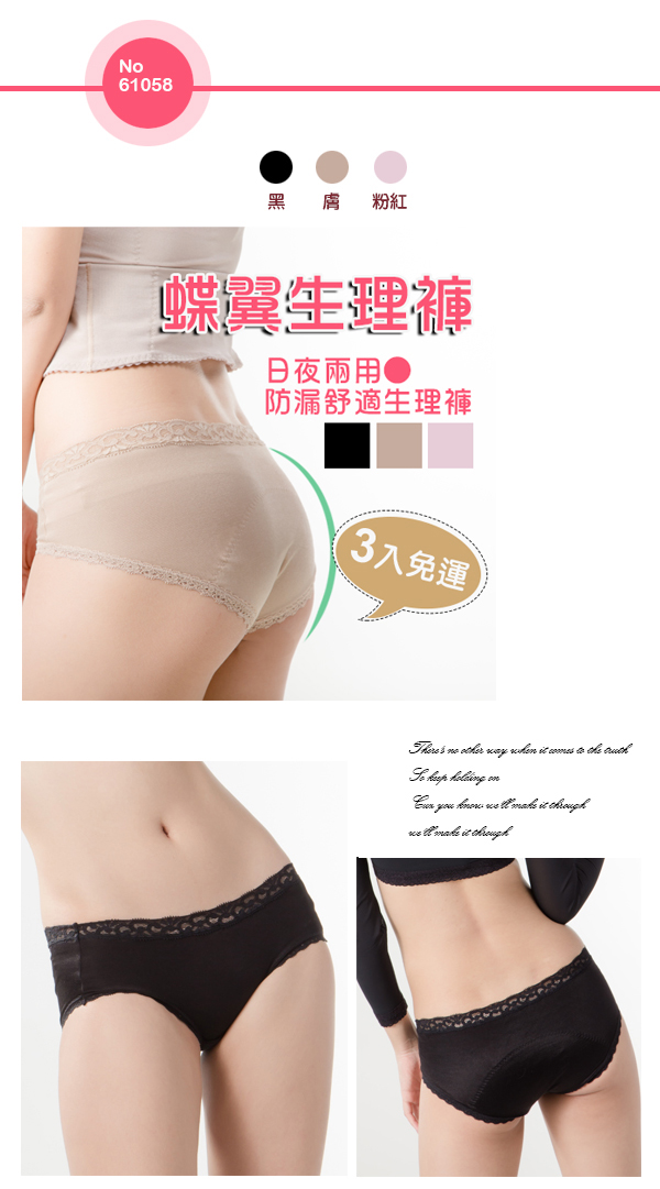 本商品規格 ‧內容物品:生理褲*3 ‧顏色:黑色/膚色/粉紅色 ‧尺寸:M /L /XL ‧材質:棉COTTON 50% 彈性纖維SPANDEX 7% 聚酯纖維POLYESTER 43% 建議消費者穿著對照尺寸: 內褲-M適合腰圍(23"~-26") 內褲-L適合腰圍(26"~29") 內褲-XL適合腰圍(29"~32") ‧產地:台灣 洗滌方式: 1.請用中性洗潔劑手洗。 2.請用溫水手洗(請深淺色衣服分開洗滌) 3.不建議烘乾熨燙。 4.洗淨後請輕扭整型後倒掛夾在衣架晾乾。