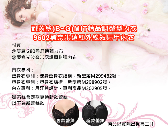 本商品標準配備 + 贈品 絲棉稱墊一對 贈品:MIT微笑標章超細萊卡小平口內褲*1(市價350元)贈品小褲款以實際出貨為主 精美內衣防塵束口袋*1 本商品規格 內衣專利:月牙片設計,專利產品M302905號。 胸墊款式:3/4罩杯絲綿 稱墊:可拆 厚度:1cm 肩帶:不可拆、可調 背釦:背扣式、三排四勾 彈性:雙層280D彈性布 顏色: 黑色 尺寸:32、34、36、38 F/G、40 F/G 內褲:M、L、XL 洗滌方式: 1.請用中性洗潔劑手洗。 2.請用溫水手洗(請深淺色衣服分開洗滌) 3.不建議烘乾熨燙。 4.洗淨後請輕扭整型後倒掛夾在衣架晾乾。 注意事項 如商品本身有暇疵問題,請於貨到7日內來電客服中心辦理退換貨服務。 因商品屬個人衛生用品,請著貼身衣物再試穿唷! 所有商品均為新品,如有拆標、下水、污損、短缺,恕不接受退換貨。 辦理商品退換貨時,商品如有贈品或配件,麻煩請一併寄回,否則視同缺件無法受理喔!.jpg)