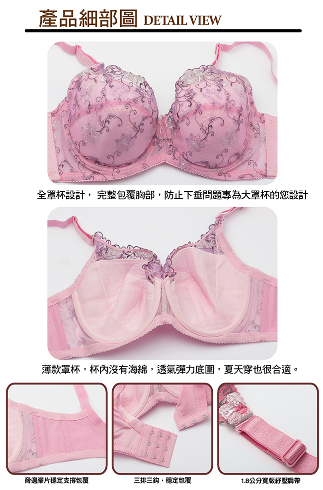 內容物品:內衣*1 胸墊款式:5/4絲綿罩杯 稱墊:無水餃口袋 厚度:0.2cm 三片式柔軟絲棉薄襯 肩帶:不可拆、可調 背釦:E、F罩三排三鉤 彈性:一般彈性布 顏色:粉紅色 尺寸:34、36、38、40、42/E、F、G 材質:尼龍 80%+彈性纖維 20% 洗滌方式: 1.請用中性洗潔劑手洗。 2.請用溫水手洗(請深淺色衣服分開洗滌) 3.不建議烘乾熨燙。 4.洗淨後請輕扭整型後倒掛夾在衣架晾乾。 注意事項 如商品本身有暇疵問題,請於貨到7日內來電客服中心辦理退換貨服務。 因商品屬個人衛生用品,請著貼身衣物再試穿唷! 所有商品均為新品,如有拆標、下水、污損、短缺,恕不接受退換貨。 辦理商品退換貨時,商品如有贈品或配件,麻煩請一併寄回,否則視同缺件無法受理喔!