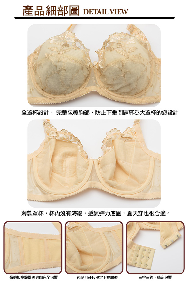 內容物品:內衣*1 胸墊款式:5/4絲綿罩杯 稱墊:無水餃口袋 厚度:0.2cm 三片式柔軟絲棉薄襯 肩帶:不可拆、可調 背釦:E、F罩三排三鉤,G罩三排四鉤 彈性:一般彈性布 顏色:膚色 尺寸:34、36、38、40、42/D、E、F、G 材質:尼龍 80%+彈性纖維 20% 洗滌方式: 1.請用中性洗潔劑手洗。 2.請用溫水手洗(請深淺色衣服分開洗滌) 3.不建議烘乾熨燙。 4.洗淨後請輕扭整型後倒掛夾在衣架晾乾。 注意事項 如商品本身有暇疵問題,請於貨到7日內來電客服中心辦理退換貨服務。 因商品屬個人衛生用品,請著貼身衣物再試穿唷! 所有商品均為新品,如有拆標、下水、污損、短缺,恕不接受退換貨。 辦理商品退換貨時,商品如有贈品或配件,麻煩請一併寄回,否則視同缺件無法受理喔!