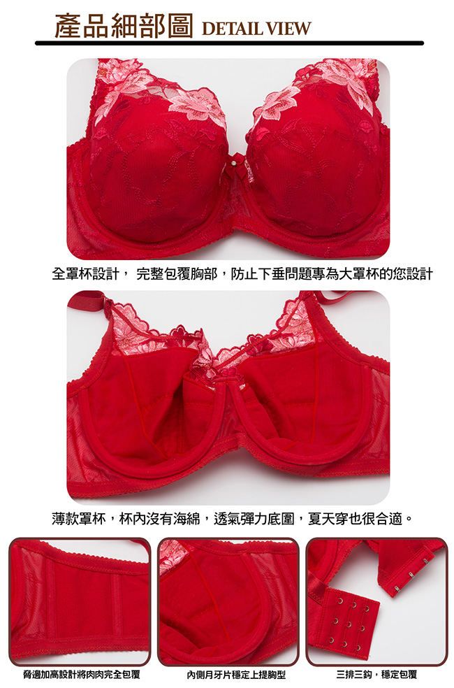 內容物品:內衣*1 胸墊款式:5/4絲綿罩杯 稱墊:無水餃口袋 厚度:0.2cm 三片式柔軟絲棉薄襯 肩帶:不可拆、可調 背釦:E、F罩三排三鉤,G罩三排四鉤 彈性:一般彈性布 顏色:紅色 尺寸:34、36、38、40、42/D、E、F、G 材質:尼龍 80%+彈性纖維 20% 洗滌方式: 1.請用中性洗潔劑手洗。 2.請用溫水手洗(請深淺色衣服分開洗滌) 3.不建議烘乾熨燙。 4.洗淨後請輕扭整型後倒掛夾在衣架晾乾。 注意事項 如商品本身有暇疵問題,請於貨到7日內來電客服中心辦理退換貨服務。 因商品屬個人衛生用品,請著貼身衣物再試穿唷! 所有商品均為新品,如有拆標、下水、污損、短缺,恕不接受退換貨。 辦理商品退換貨時,商品如有贈品或配件,麻煩請一併寄回,否則視同缺件無法受理喔!