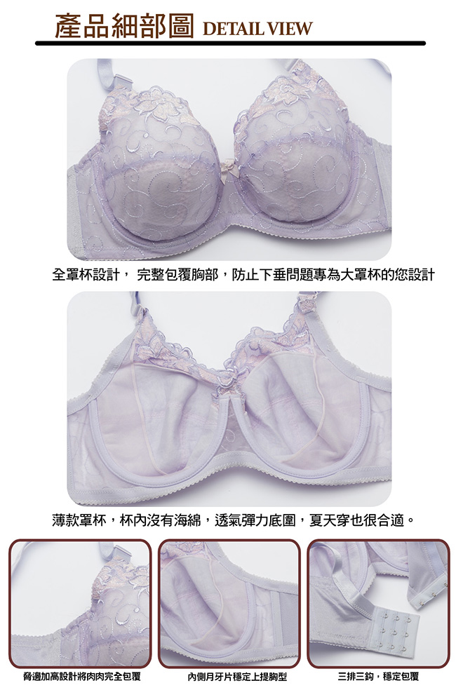 內容物品:內衣*1 胸墊款式:5/4絲綿罩杯 稱墊:無水餃口袋 厚度:0.2cm 三片式柔軟絲棉薄襯 肩帶:不可拆、可調 背釦:E、F罩三排三鉤,G罩三排四鉤 彈性:一般彈性布 顏色:紫色 尺寸:34、36、38、40、42/D、E、F、G 材質:尼龍 80%+彈性纖維 20% 洗滌方式: 1.請用中性洗潔劑手洗。 2.請用溫水手洗(請深淺色衣服分開洗滌) 3.不建議烘乾熨燙。 4.洗淨後請輕扭整型後倒掛夾在衣架晾乾。 注意事項 如商品本身有暇疵問題,請於貨到7日內來電客服中心辦理退換貨服務。 因商品屬個人衛生用品,請著貼身衣物再試穿唷! 所有商品均為新品,如有拆標、下水、污損、短缺,恕不接受退換貨。 辦理商品退換貨時,商品如有贈品或配件,麻煩請一併寄回,否則視同缺件無法受理喔!