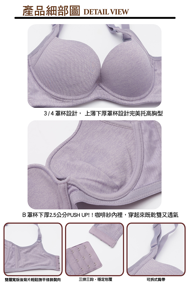 內容物品:內衣*1 胸墊款式:3/4罩杯、B罩下厚上薄加厚2.5CM、C罩均勻薄襯 稱墊:不可拆 厚度:2.5cm 肩帶:不可拆、可調 背釦:三排三鉤扣 彈性:雙層一般彈性布 顏色:紫色 尺寸:32、34、36、38/A、B 材質:聚酯纖維 70% +彈性纖維 30% 產地:台灣 洗滌方式: 1.請用中性洗潔劑手洗。 2.請用溫水手洗(請深淺色衣服分開洗滌) 3.不建議烘乾熨燙。 4.洗淨後請輕扭整型後倒掛夾在衣架晾乾。 注意事項 如商品本身有暇疵問題,請於貨到7日內來電客服中心辦理退換貨服務。 因商品屬個人衛生用品,請著貼身衣物再試穿唷! 所有商品均為新品,如有拆標、下水、污損、短缺,恕不接受退換貨。 辦理商品退換貨時,商品如有贈品或配件,麻煩請一併寄回,否則視同缺件無法受理喔!