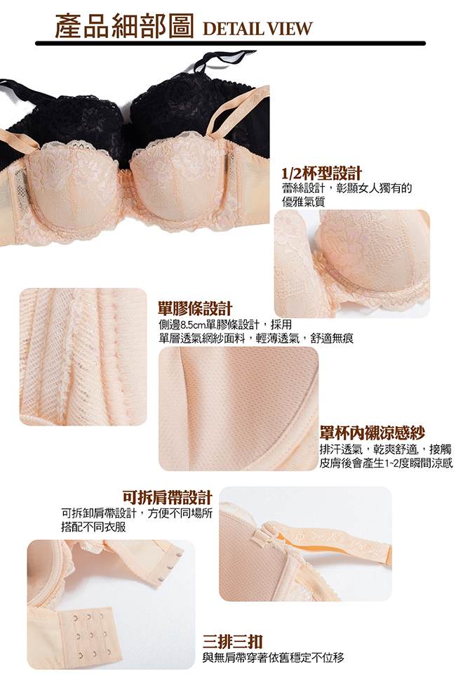 *1/2杯型設計,可拆卸肩帶設計,更好搭配禮服穿著,經典蕾絲設計彰顯女人獨有的優雅氣質。