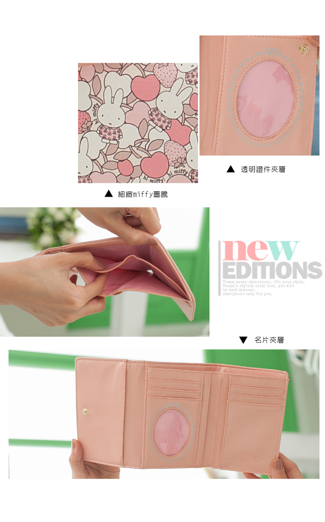 品 牌:荷蘭【Miffy】 商品名稱:荷蘭【Miffy】草莓甜心系列-壓扣中夾 尺 寸:長:14cm 寬:10cm 厚:3cm 材 質:棉+PVC防潑水膜 內 裏:亮面光澤布 商品配件:禮品專用紙袋 夾層設計:卡片夾層*7 暗層袋*4 鈔票格層*2 相片夾層*1 菲買不可 ★知名荷蘭專櫃品牌.成功擄獲女性芳心 ★送禮自用兩相宜.收到禮物最動心 ★草莓甜心春季新款 ★俐落流線設計.迎合時尚流行的需求 ★高成本投入,配件時尚配色處理,展現個人風格 ★新設計防刮皮面材質.防刮、耐磨、防潑水 ★超輕材質.手感極佳,手拿超方便 ★凡購買Miffy品牌之任一商品皆享有1個月免費保固維修(非人為因素損壞).jpg)