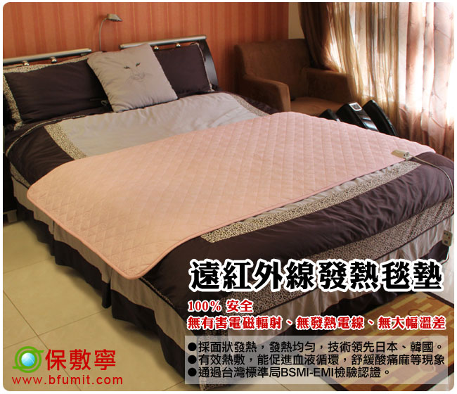 保健全身肌肉關節,舒緩「酸、痛、麻」。 將毯墊放置於床罩下 天天使用給您一夜好眠,早上起床精神百倍!!! 遠紅外線的特點 令水分子活性化,提高身體的含氧量 人體約70%是水,遠紅外線能使水分子產生共振,提高身體的含氧量,細胞因而恢復活力,使人精力更旺盛!!進而提高抗病能力,延緩衰老。 改善循環系統 人體水分子通過共振,提高皮下深層的溫度,促進血流速度,同時提供人體細胞氧氣和營養,可有效預防高血壓,心血管疾病,腫瘤,關節炎,四肢冰冷麻痺等疾病。 促進新陳代謝 循環系統得到改善後,新陳代謝產生的廢物,以及引發病痛的尿酸可迅速排出體外,並減輕肝臟及腎臟負擔。 平衡身體的酸鹼度 遠紅外線能淨化血液,改善皮膚,預防因尿酸過高而導致骨骼關節疼痛,並能降低電磁波對人體的干擾。 保敷寧採整塊碳纖維面狀發熱體,受熱均勻。 有效熱敷,能促進血液循環,舒緩酸痛麻等現象 產品內容 一.遠紅外線發熱膜組(發熱膜x1、毯墊布套x1、溫度控制儀及DC接頭x1) 二.24V 3A低壓直流電源供應器x1 (贈品) 三.說明書(內含保證卡) 產品規格 一.尺寸: H1000MM x 1900MM 二.使用低壓直流24V 3A 操作說明 1. 先將電源適配器的DC插頭插入溫控器DC插孔中,再將電源適配器的AC電源插頭插入110V-220V市電插座中並插緊, 通電後機器進入待機狀態。 2.開機:長按"開/關"鍵約3至5秒開機,顯示幕顯示當前暖墊溫度。 3.溫度設定:按"加"或"減"鍵設定適合您的溫度(建議30~35`C),此時顯示幕顯示的是您設定的溫度,最高設定溫度為50度(停止操作3秒後顯示幕返回當前暖墊溫度顯示)。 4.預約關機設定:在開機狀態下,長按"預約"鍵3至5秒,顯示幕顯示"00",按"加"或"減"鍵設定您要預約幾小時後關機,同時預約指示燈點亮、顯示幕顯示距離關機時間(停止操作3至5秒後顯示幕返回當前暖墊溫度顯示) 5.手動關機:在開機狀態下,長按"開/關"鍵約3至5秒關機,顯示幕和指示燈熄滅進入待機狀態。 當設定的溫度高於當前暖墊溫度1`C開始加熱,同時加熱指示燈點亮,當設定的溫度低於當前暖墊溫度1`C停止加熱,同時加熱指示燈熄滅,如此迴圈來恒定暖墊溫度。 注意事項 1.使用任何產品前請仔細閱讀說明書。 2.請將遠紅外線系列產品放在手上及身體需要熱敷部位(嚴禁通電使用時折皺,以免過熱危險)。 3.嚴禁在遠紅外產品上放置其他發熱器具(如熱水袋,暖手包等)加熱,以免造成過熱危險或損壞產品。 4.不可用尖銳物品刺破產品,避免有觸電危險。 5.為避免意外,兒童及生活不能自理的人應在監護人的照看下使用產品。◎孕婦及重大疾病者,請依照醫師指示斟酌使用。 6. 如發現產品不熱的情況時,請先檢查接線是否都正確,連接處是否插緊,當接線正常但不熱時,應送到指定的維修點維修。不得隨意自行拆修。如自行拆修導致產品無法修復或引起意外,由用戶自行負責承擔損失。 7. 產品不用時應放在乾燥通風處,需防潮,防摔,防塵,上面不能壓重物,避免壓出褶皺。不能烘烤,不能熨燙,不能水洗,避免造成發熱體絕緣層損壞。 8. 長期不使用時,應拔掉產品電源插頭,杜絕事故隱患,不可用拉扯電源線的方式拔起插頭或拖拉溫控器。 9. 為保證品質,請使用本公司配備的專用電源,溫控器不可放置於加熱的產品上。 10. 使用產品時請按自身適宜的溫度,勿設定過高以確保安全。 ※本組件發熱膜不可,洗滌,摺皺,烘烤,不可整燙。 ※注意:若有過敏現象之人,請穿著輕薄衣物,避免直接接觸皮膚。 ※本產品以投保富邦產物保險股份有限公司產品責任保險1,000萬產品責任險 ※本產品通過臺灣標準檢驗局BSMI-EMI電器檢驗認證。 保修須知 1.請如實填寫保修單,本保修單請妥善保管,以作為維修憑證。 2.本產品保修期為一年。 3.品質保證:保修期內無法維修的產品可進行調換,可以修復的產品進行無償維修。在保修期內產品使用者未按照說明書使用產品,進行違規使用所出現的產品故障為有償維修。