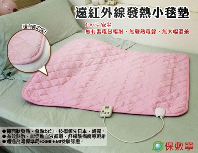 保健全身肌肉關節,舒緩「酸、痛、麻」。 將毯墊放置於床罩下 天天使用給您一夜好眠,早上起床精神百倍!!! 遠紅外線的特點 令水分子活性化,提高身體的含氧量 人體約70%是水,遠紅外線能使水分子產生共振,提高身體的含氧量,細胞因而恢復活力,使人精力更旺盛!!進而提高抗病能力,延緩衰老。 改善循環系統 人體水分子通過共振,提高皮下深層的溫度,促進血流速度,同時提供人體細胞氧氣和營養,可有效預防高血壓,心血管疾病,腫瘤,關節炎,四肢冰冷麻痺等疾病。 促進新陳代謝 循環系統得到改善後,新陳代謝產生的廢物,以及引發病痛的尿酸可迅速排出體外,並減輕肝臟及腎臟負擔。 平衡身體的酸鹼度 遠紅外線能淨化血液,改善皮膚,預防因尿酸過高而導致骨骼關節疼痛,並能降低電磁波對人體的干擾。 保敷寧採整塊碳纖維面狀發熱體,受熱均勻。 有效熱敷,能促進血液循環,舒緩酸痛麻等現象 產品內容 一.遠紅外線發熱膜組(發熱膜x1、毯墊布套x1、溫度控制儀及DC接頭x1) 二.24V 2A低壓直流電源供應器x1 (贈品) 三.說明書(內含保證卡) 產品規格 一.尺寸: H70MM x 80MM 二.使用低壓直流24V 2A 操作說明 1. 先將電源適配器的DC插頭插入溫控器DC插孔中,再將電源適配器的AC電源插頭插入110V-220V市電插座中並插緊, 通電後機器進入待機狀態。 2.開機:長按"開/關"鍵約3至5秒開機,顯示幕顯示當前暖墊溫度。 3.溫度設定:按"加"或"減"鍵設定適合您的溫度(建議30~35`C),此時顯示幕顯示的是您設定的溫度,最高設定溫度為50度(停止操作3秒後顯示幕返回當前暖墊溫度顯示)。 4.預約關機設定:在開機狀態下,長按"預約"鍵3至5秒,顯示幕顯示"00",按"加"或"減"鍵設定您要預約幾小時後關機,同時預約指示燈點亮、顯示幕顯示距離關機時間(停止操作3至5秒後顯示幕返回當前暖墊溫度顯示) 5.手動關機:在開機狀態下,長按"開/關"鍵約3至5秒關機,顯示幕和指示燈熄滅進入待機狀態。 當設定的溫度高於當前暖墊溫度1`C開始加熱,同時加熱指示燈點亮,當設定的溫度低於當前暖墊溫度1`C停止加熱,同時加熱指示燈熄滅,如此迴圈來恒定暖墊溫度。 注意事項 1.使用任何產品前請仔細閱讀說明書。 2.請將遠紅外線系列產品放在手上及身體需要熱敷部位(嚴禁通電使用時折皺,以免過熱危險)。 3.嚴禁在遠紅外產品上放置其他發熱器具(如熱水袋,暖手包等)加熱,以免造成過熱危險或損壞產品。 4.不可用尖銳物品刺破產品,避免有觸電危險。 5.為避免意外,兒童及生活不能自理的人應在監護人的照看下使用產品。◎孕婦及重大疾病者,請依照醫師指示斟酌使用。 6. 如發現產品不熱的情況時,請先檢查接線是否都正確,連接處是否插緊,當接線正常但不熱時,應送到指定的維修點維修。不得隨意自行拆修。如自行拆修導致產品無法修復或引起意外,由用戶自行負責承擔損失。 7. 產品不用時應放在乾燥通風處,需防潮,防摔,防塵,上面不能壓重物,避免壓出褶皺。不能烘烤,不能熨燙,不能水洗,避免造成發熱體絕緣層損壞。 8. 長期不使用時,應拔掉產品電源插頭,杜絕事故隱患,不可用拉扯電源線的方式拔起插頭或拖拉溫控器。 9. 為保證品質,請使用本公司配備的專用電源,溫控器不可放置於加熱的產品上。 10. 使用產品時請按自身適宜的溫度,勿設定過高以確保安全。 ※本組件發熱膜不可,洗滌,摺皺,烘烤,不可整燙。 ※注意:若有過敏現象之人,請穿著輕薄衣物,避免直接接觸皮膚。 ※本產品以投保富邦產物保險股份有限公司產品責任保險1,000萬產品責任險 ※本產品通過臺灣標準檢驗局BSMI-EMI電器檢驗認證。 保修須知 1.請如實填寫保修單,本保修單請妥善保管,以作為維修憑證。 2.本產品保修期為一年。 3.品質保證:保修期內無法維修的產品可進行調換,可以修復的產品進行無償維修。在保修期內產品使用者未按照說明書使用產品,進行違規使用所出現的產品故障為有償維修。