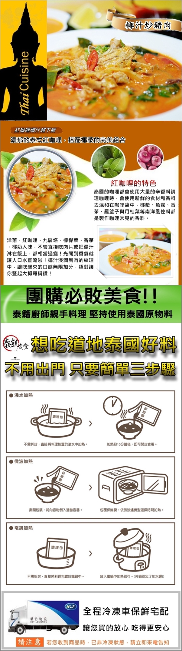 .商品成份:豬肉片、紅咖哩、洋蔥、辣椒、蒜頭、檸檬葉、九層塔、蠔油、椰奶、細砂