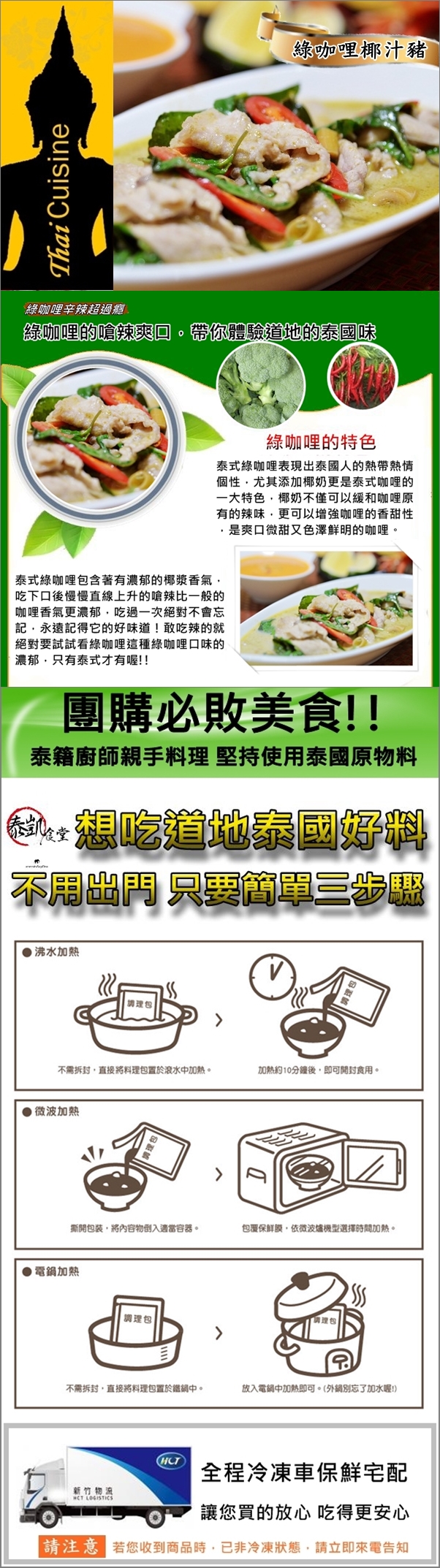 .商品成份:豬肉片、綠咖哩、魚露、菜豆、辣椒、檸檬葉、玉米筍、香茅、南薑、椰奶