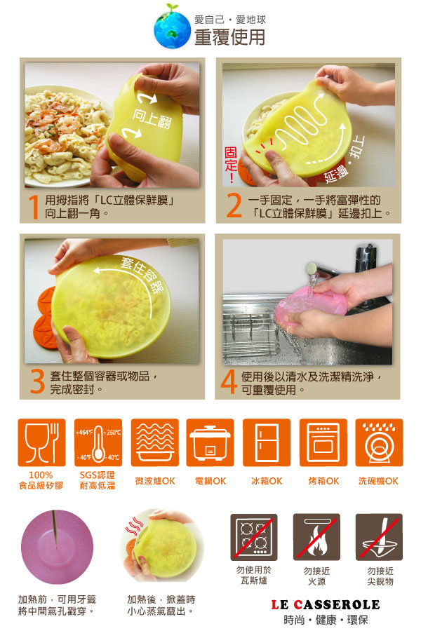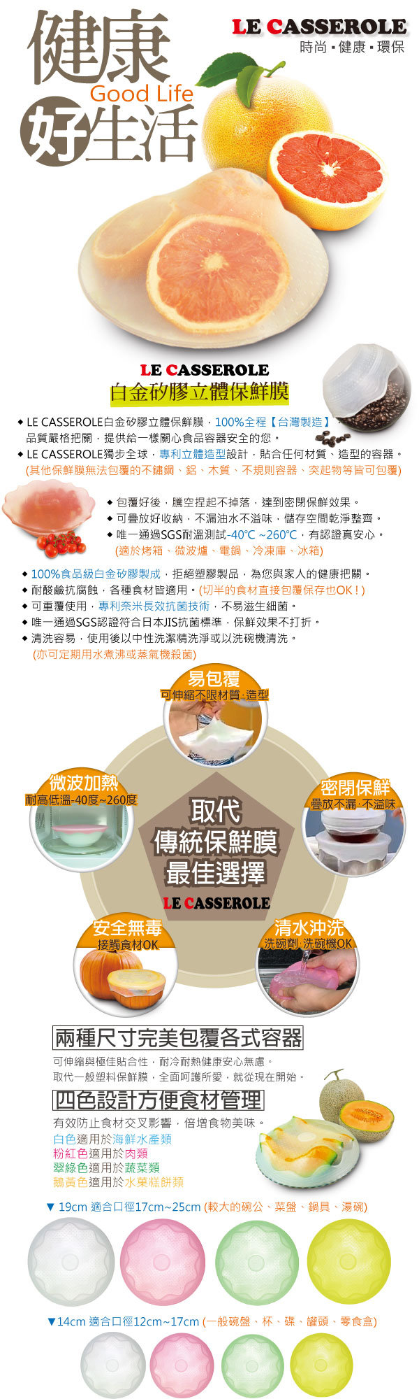 -取代傳統有毒保鮮膜的最佳選擇- 【LE CASSEROLE】白金矽膠立體保鮮膜 ‧ 材 質: 100%食品級白金矽膠 (與嬰兒奶嘴同材質) ‧ 耐冷熱度: -40 度 C ~ 260 度C ‧ 尺寸數量: 14cm*4 ‧ 顏 色: 白色 ‧ 產 地: 台灣製 ★ 矽膠保鮮膜第一品牌 ★ *100%食品級白金矽膠製造,健康安心無慮* ◆ 可重複使用,好清洗,好收納,環保愛地球 ◆ 應用奈米技術【長效抗菌】 ◆ 兩種尺寸完美包覆所有尺寸容器,各種造型或材質皆可 ◆ 食品級白金矽膠耐酸抗腐蝕性,各種食材皆適用 ◆ 適於烤箱、微波爐、電鍋及冰箱,安心無慮 1. 符合衛署食品容器包裝法令不含塑化劑 2. 符合美國FDA食品級規範 3. 符合歐盟EN規範不含有毒重金屬 4. 符合日本JIS抗菌規範 5. 通過高低溫驗證(-40℃ ~ 260℃) ★感謝TV推薦: http://www.youtube.com/watch?v=0FbBV62iiFc ★產品介紹:http://www.youtube.com/watch?v=0ba_UQBOtcA&feature=youtu.be ★專家訪談:http://www.youtube.com/watch?v=1x14XA8nXGA&feature=player_embedded#! ★使用說明:http://www.youtube.com/watch?feature=player_embedded&v=d7pUxxmC-IE.jpg)