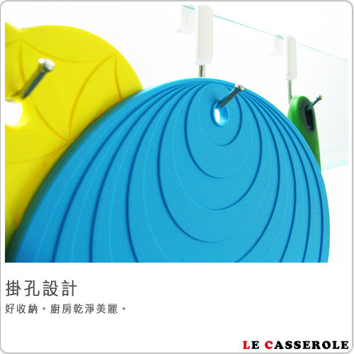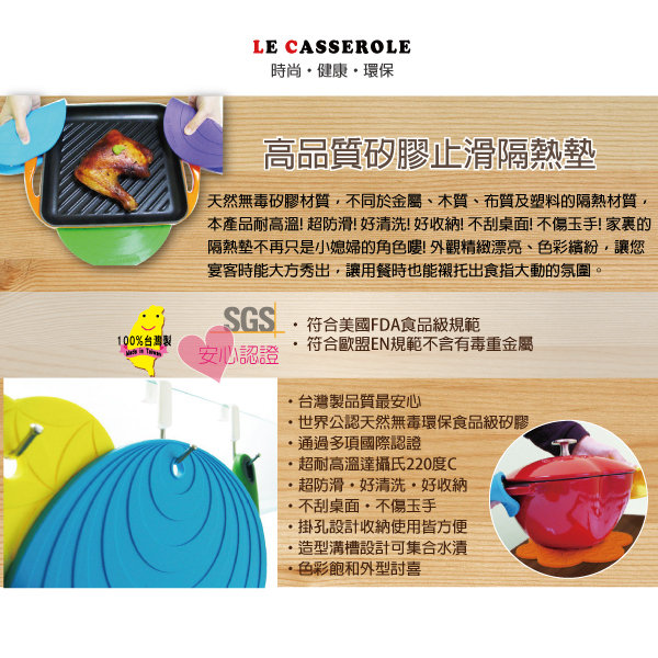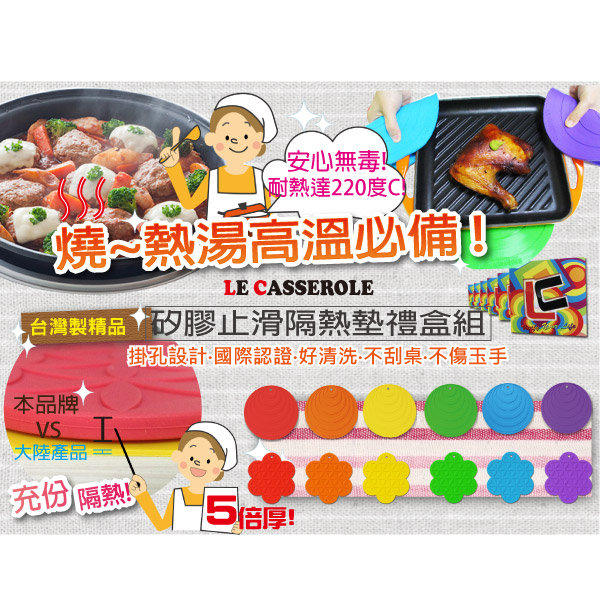 家裏的隔熱墊不再只是小媳婦的角色嘍! 天然無毒矽膠材質,不同於金屬、木質、布質及塑料的隔熱材質,本產品耐高溫!超防滑!好清洗!好收納!不刮桌面!不傷玉手!家裏的隔熱墊不再只是小媳婦的角色嘍!外觀精緻漂亮、色彩繽紛,讓您宴客時能大方秀出,讓用餐時也能襯托出食指大動的氛圍。 符合美國FDA核准的食品級規範及歐盟EN規範不含有毒重金屬,使用上安全無慮。廚房料理外,還可當止滑墊廣泛地運用於汽車、客廳及辦公桌等地方。唯有台灣製造,品質最另人安心,「LE CASSEROLE矽膠止滑隔熱墊」是您居家生活最好的選擇哦。 ‧台灣製品質最安心 ‧世界公認天然無毒環保食品級矽膠 ‧通過SGS檢驗符合美國FDA食品級矽膠標準 ‧通過SGS檢驗符合歐盟EN不含重金屬標準 ‧超耐高溫達攝氏220度C ‧超防滑‧好清洗‧好收納 ‧不刮桌面‧不傷玉手 ‧掛孔設計收納使用皆方便 ‧造型溝槽設計可集合水漬 ‧色彩飽和外型討喜 商品簡介: •品名: 花開富貴矽膠止滑隔熱墊禮盒6入 •尺寸: 直徑200mm x 高5mm(單片) •材質: 食品級白金矽膠(與兒童奶嘴同材質,通過SGS檢驗合格) •耐冷熱範圍: -40℃~220℃ •顏色: 紅、橙、黃、綠、藍、紫(共6色).jpg)