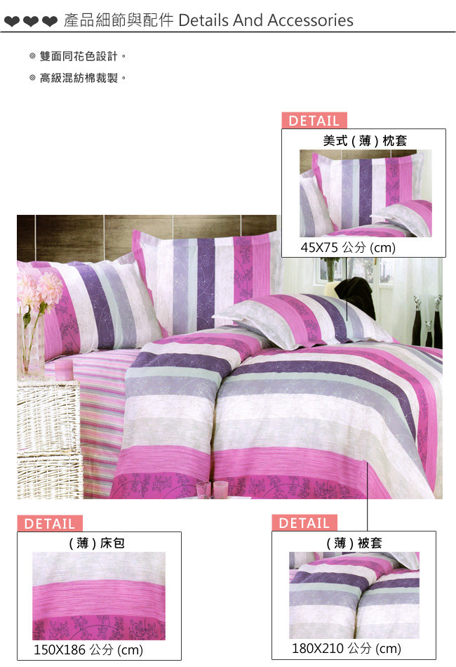 【條韻華彩】5.0呎x6.2呎-雙面同花色-四件式雙人(薄)被套床包組 ◆採高級裁縫技術,車工細膩,無論是造型設計,顏色搭配等,每個地方都是精心傑作,造型高雅大方,質地細緻,觸感極佳。 ◆多用途舒適被套設計,無論是在臥房,在客廳,在車上,春天、秋天、夏天等溫度較熱的季節裡及冷氣房中使用,涼爽宜人。 ◆(薄)被套體積輕薄,好收藏不佔空間,細緻耐用,觸感極佳舒適,清洗晾曬非常簡單,是您不可錯過的最佳選擇。 ◆流行時尚的圖樣設計,以全花版面精工製作,搭配抒情優雅的色系,圖案立體,色彩典雅,保證色彩鮮明。 ◆雙面同花色(薄)被套床包組之材質以精梳混紡棉為主,兼具舒適感及耐用性,不分季節,四季皆可使用。 ◆印染的製程是特別經過電腦製樣、印染、上色等製程,不易退色,充分表現出高品質的國際水準。 ◆本產品為[四件式雙人(薄)被套床包組],附一套雙人(薄)床包/二個美式(薄)枕套/一套雙人(薄)被套。 ◆本產品特殊的地方可適用於[獨立筒彈簧床墊],床包內朿可朿32公分高之獨立筒彈簧床墊。