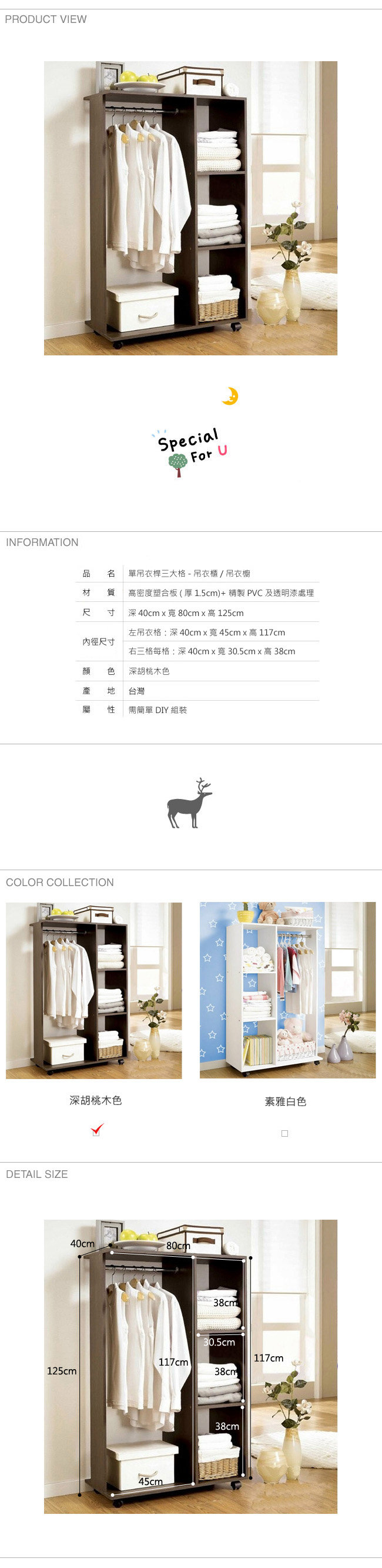 ◆吊衣櫃內徑尺寸:45公分[寬]x40公分[深]x117公分[高]、三格每格內徑尺寸:30.5公分[寬]x40公分[深]38公分[高]