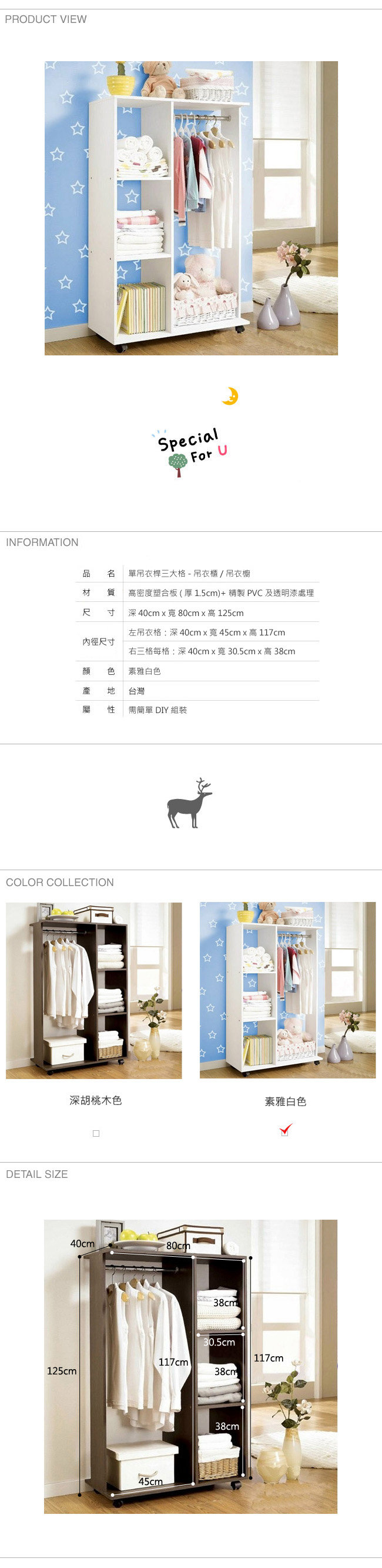◆商品品名:40公分[深]x80公分[寬]x125公分[高](單吊衣桿三大格)-吊衣櫃/吊衣櫥