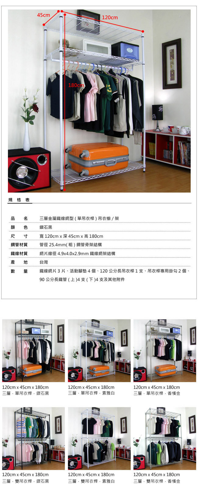 45DX120WX180H公分-三層[金屬鐵線網型](單吊衣桿)吊衣架-(鑽石黑) ◆45[深]x120[寬]x180[高]/公分[鐵線網型]三層吊衣架,每層平圴承重力約100公斤。 ◆120公分四尺[寬]多功能[金屬鐵線網型]三層吊衣架,可吊掛任何衣物和衣物收納袋。 ◆商品完全DIY組裝,美觀實用,鐵線網型,可放置衣物和一般物品及任何[大型]物品。 ◆本商品表面為鑽石黑[不生鏽粉體處理],網架完全可DIY組裝,結構簡單、拆組容易。 ◆金屬[鐵線]網架,任何地點皆適用,營業用,工業用,家庭用,店面,倉儲,住家,搭配性強。 ◆[精品嚴選] 100%台灣製造,結構簡單、組合方便,拆裝容易,不傷網架本體,再次使用品質不變。 ◆每片金屬[鐵線]網架高度,可依需求自行調整,要高要低隨心所欲,可依照需求隨時調整,隨時變換。 ◆鐵線材質:網片線徑4.9x4.0x2.9mm(橫線16條/直線10條)鐵線網架 結構,粉體防鏽處理,耐刮、耐磨。 ◆商品屬性:簡單DIY組裝(即可輕鬆組合完成),四支腳皆有腳墊,可隨意調整高度,適用於不平之地面。 ◆鐵線網片3片、活動腳墊4個、120公分長吊衣桿1支、吊衣桿專用掛勾2個、90公分長鐵管(上)4支(下)4支及其他附件。 ◆商品尺寸為120 公分[寬] X 45 公分[深] X 180 公分[高]。 ◆鋼管材質:鋼管管徑25.4mm(粗) 鋼管骨架 結構。 ◆商品屬性:簡單DIY [組合方便,拆裝容易]。 ◆商品產地:[精品嚴選] 100%台灣製造。