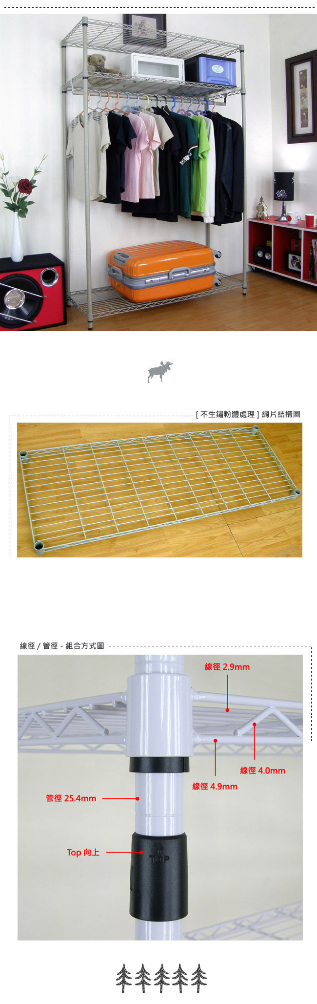 ◆商品數量:鐵線網片3片、活動腳墊4個、120公分長吊衣桿1支、吊衣桿專用掛勾2個、90公分長鐵管(上)4支(下)4支及其他附件