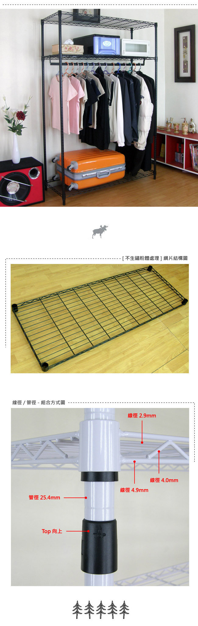 ◆商品數量:鐵線網片3片、活動腳墊4個、120公分長吊衣桿1支、吊衣桿專用掛勾2個、90公分長鐵管(上)4支(下)4支及其他附件