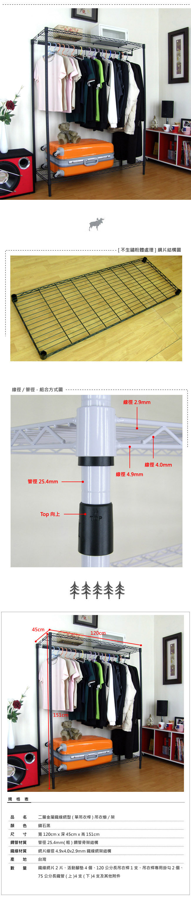 45Dx120Wx151H公分-二層[鐵線網型](單吊衣桿)吊衣架-鑽石黑 ◆45(深)x120(寬)x151(高)/公分[鐵線網型]二層衣架,每層平圴承重力約100公斤(整組承重力約200公斤)。 ◆120公分四尺[寬]多功能[金屬鐵線網型]二層吊衣架,可吊掛任何衣物和衣物收納袋。 ◆每片金屬[鐵線]網架高度可依需求自行調整,要高要低隨心所欲,可依照需求隨時調整,隨時變換。 ◆鐵線材質:網片線徑4.9x4.0x2.9mm(橫線16條/直線10條)鐵線網架 結構,粉體防鏽處理,耐刮、耐磨。 ◆[精品嚴選] 100%台灣製造,結構簡單、組合方便,拆裝容易,不傷網架本體,再次使用品質不變。 ◆金屬[鐵線]網架,任何地點皆適用,營業用,工業用,家庭用,店面,倉儲,住家,搭配性強。 ◆商品完全DIY組裝,美觀實用,鐵線網型,可放置衣物和一般物品及任何衣物。 ◆四支腳皆有腳墊,可隨意調整高度,適用於不平之地面。 ◆本商品網架承重力約 100公斤、網架高度:151 公分。 ◆商品尺寸為120公分(寬) X 45公分(深) X 151公分(高)。 ◆商品屬性:簡單DIY組裝(即可輕鬆組合完成)。 ◆鐵線網片2片、活動腳墊4個、120公分長吊衣桿1支、吊衣桿專用掛勾2個、75公分長鐵管(上)4支(下)4及其他配件。
