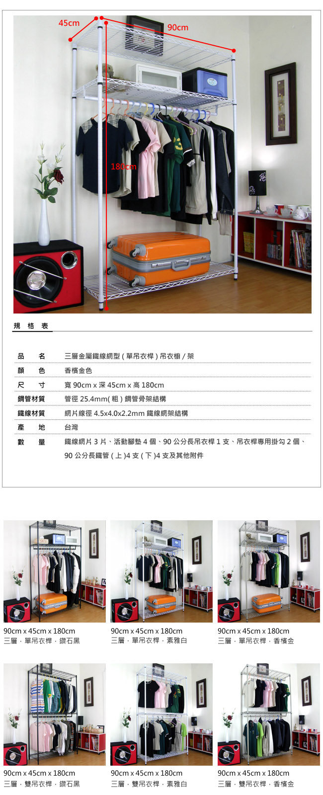 45DX90WX180H/公分三層[金屬鐵線網型](單吊衣桿)吊衣架(香檳金色) ◆45[深]x90[寬]x180[高]/公分[鐵線網型]三層吊衣架,每層平圴承重力約100公斤。 ◆90公分三尺[寬]多功能[金屬鐵線網型]三層吊衣架,可吊掛任何衣物和衣物收納袋。 ◆商品完全DIY組裝,美觀實用,鐵線網型,可放置衣物和一般物品及任何[中型]物品。 ◆本商品表面為香檳金色[不生鏽粉體處理],網架完全可DIY組裝,結構簡單、拆組容易。 ◆金屬[鐵線]網架,任何地點皆適用,營業用,工業用,家庭用,店面,倉儲,住家,搭配性強。 ◆[精品嚴選] 100%台灣製造,結構簡單、組合方便,拆裝容易,不傷網架本體,再次使用品質不變。 ◆每片金屬[鐵線]網架高度,可依需求自行調整,要高要低隨心所欲,可依照需求隨時調整,隨時變換。 ◆鐵線材質:網片線徑4.5x4.0x2.2mm(橫線16條/直線6條)鐵線網架 結構,粉體防鏽處理,耐刮、耐磨。 ◆商品屬性:簡單DIY組裝(即可輕鬆組合完成),四支腳皆有腳墊,可隨意調整高度,適用於不平之地面。 ◆鐵線網片3片、活動腳墊4個、90公分長吊衣桿1支、吊衣桿專用掛勾2個、90公分長鐵管(上)4支(下)4及其他附件。 ◆商品尺寸為90 公分[寬] X 45 公分[深] X 180 公分[高]。 ◆鋼管材質:鋼管管徑25.4mm(粗) 鋼管骨架 結構。 ◆商品屬性:簡單DIY [組合方便,拆裝容易]。 ◆商品產地:[精品嚴選] 100%台灣製造。