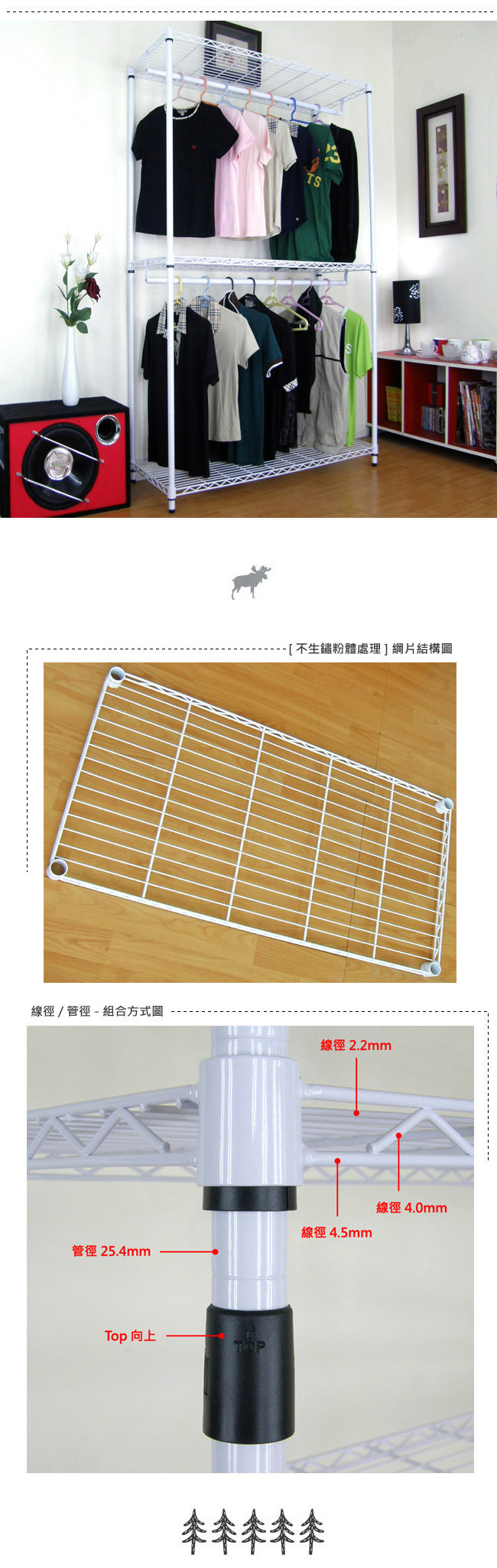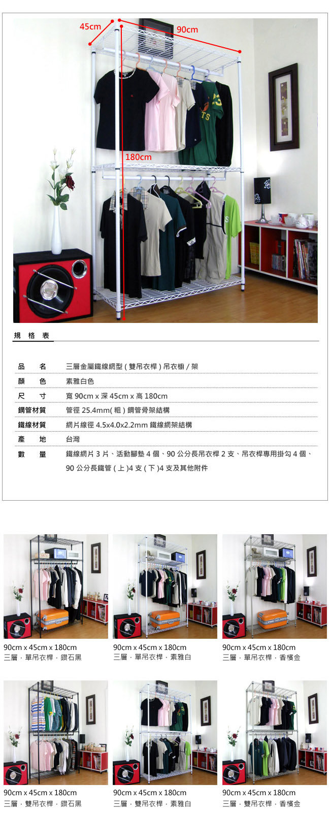 45DX90WX180H/公分三層[金屬鐵線網型](雙吊衣桿)吊衣架/吊衣櫥(素雅白色) ◆45[深]x90[寬]x180[高]/公分[鐵線網型]三層吊衣櫥,每層平圴承重力約100公斤。 ◆90公分三尺[寬]多功能[金屬鐵線網型]三層吊衣櫥,可吊掛任何衣物和衣物收納袋。 ◆商品完全DIY組裝,美觀實用,鐵線網型,可放置衣物和一般物品及任何[中型]物品。 ◆本商品表面為素雅白色[不生鏽粉體處理],網架完全可DIY組裝,結構簡單、拆組容易。 ◆金屬[鐵線]網架,任何地點皆適用,營業用,工業用,家庭用,店面,倉儲,住家,搭配性強。 ◆[精品嚴選] 100%台灣製造,結構簡單、組合方便,拆裝容易,不傷網架本體,再次使用品質不變。 ◆每片金屬[鐵線]網架高度,可依需求自行調整,要高要低隨心所欲,可依照需求隨時調整,隨時變換。 ◆鐵線材質:網片線徑4.5x4.0x2.2mm(橫線16條/直線6條)鐵線網架 結構,粉體防鏽處理,耐刮、耐磨。 ◆商品屬性:簡單DIY組裝(即可輕鬆組合完成),四支腳皆有腳墊,可隨意調整高度,適用於不平之地面。 ◆鐵線網片3片、活動腳墊4個、90公分長吊衣桿2支、吊衣桿專用掛勾4個、90公分長鐵管(上)4支(下)4及其他附件。 ◆商品尺寸為90 公分[寬] X 45 公分[深] X 180 公分[高]。 ◆鋼管材質:鋼管管徑25.4mm(粗) 鋼管骨架 結構。 ◆商品屬性:簡單DIY [組合方便,拆裝容易]。 ◆商品產地:[精品嚴選] 100% 台灣製造。