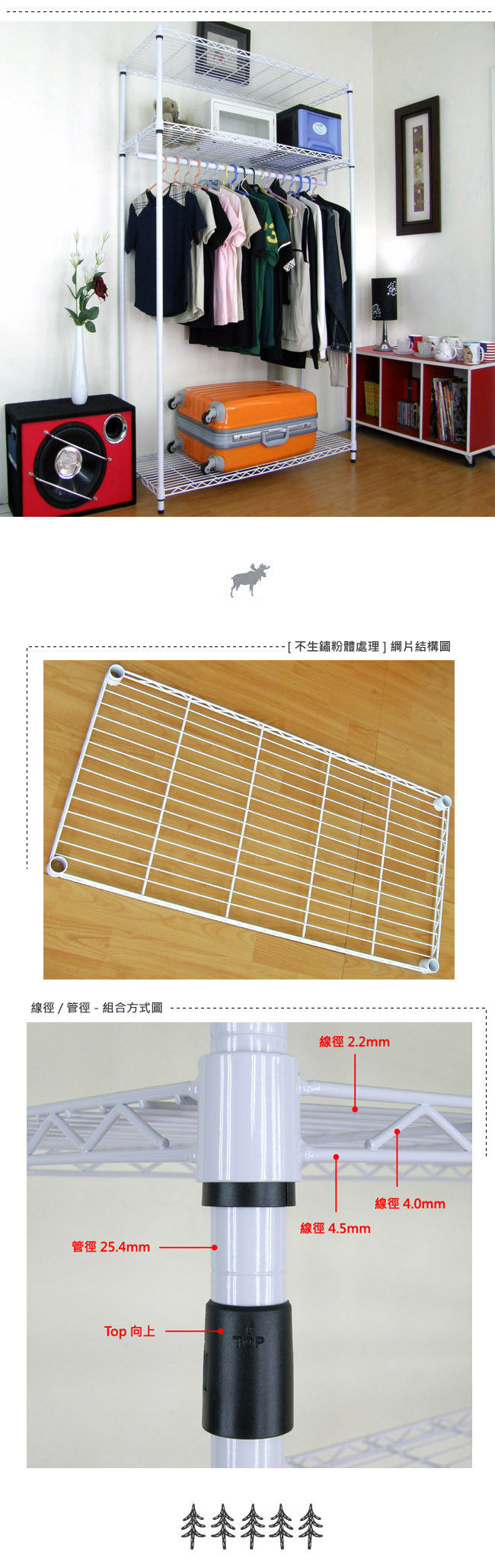 45DX90WX180H/公分三層[金屬鐵線網型](雙吊衣桿)吊衣架-吊衣櫥[素雅白]-[含布套]11色可選 ◆45[深]x90[寬]x180[高]/公分[鐵線網型]三層吊衣櫥,每層平圴承重力約100公斤。 ◆90公分三尺[寬]多功能[金屬鐵線網型]三層吊衣櫥,可吊掛任何衣物和衣物收納袋。 ◆商品完全DIY組裝,美觀實用,鐵線網型,可放置衣物和一般物品及任何[中型]物品。 ◆本商品表面為(素雅白)[不生鏽粉體處理],網架完全可DIY組裝,結構簡單、拆組容易。 ◆金屬[鐵線]網架,任何地點皆適用,營業用,工業用,家庭用,店面,倉儲,住家,搭配性強。 ◆[精品嚴選] 100%台灣製造,結構簡單、組合方便,拆裝容易,不傷網架本體,再次使用品質不變。 ◆每片金屬[鐵線]網架高度,可依需求自行調整,要高要低隨心所欲,可依照需求隨時調整,隨時變換。 ◆鐵線材質:網片線徑4.5x4.0x2.2mm(橫線16條/直線6條)鐵線網架 結構,粉體防鏽處理,耐刮、耐磨。 ◆商品屬性:簡單DIY組裝(即可輕鬆組合完成),四支腳皆有腳墊,可隨意調整高度,適用於不平之地面。 ◆鐵線網片3片、活動腳墊4個、90公分長吊衣桿2支、吊衣桿專用掛勾4個、90公分長鐵管(上)4支(下)4及其他附件。 ◆商品尺寸為90 公分[寬] X 45 公分[深] X 180 公分[高]。 ◆鋼管材質:鋼管管徑25.4mm(粗) 鋼管骨架 結構。 ◆商品屬性:簡單DIY [組合方便,拆裝容易]。 ◆商品產地:[精品嚴選] 100% 台灣製造。 [含吊衣櫥專用全蓋式T型拉鍊防塵布套]-11色可選 ◆本商品為[專用全蓋式T型拉鍊防塵布套],尺寸為91 公分[寬] X 46 公分[深] X 180公分[高]。 ◆本商品[專用全蓋式T型拉鍊防塵布套],防塵效果特佳、布套顏色美觀又大方、鮮豔奪目。 ◆商品屬性為簡單DIY [套上即可使用]、商品材質為彩色不織布[精品嚴選] 。 ◆(吊衣櫥專用-全蓋式"T"型拉鍊防塵布套)共11色可選:喜氣紅、深藍色、棗紅色、米白色、咖啡色、粉紅色、水藍色、米棕紅條紋、藍白方格、粉紅條格、棕白方格。