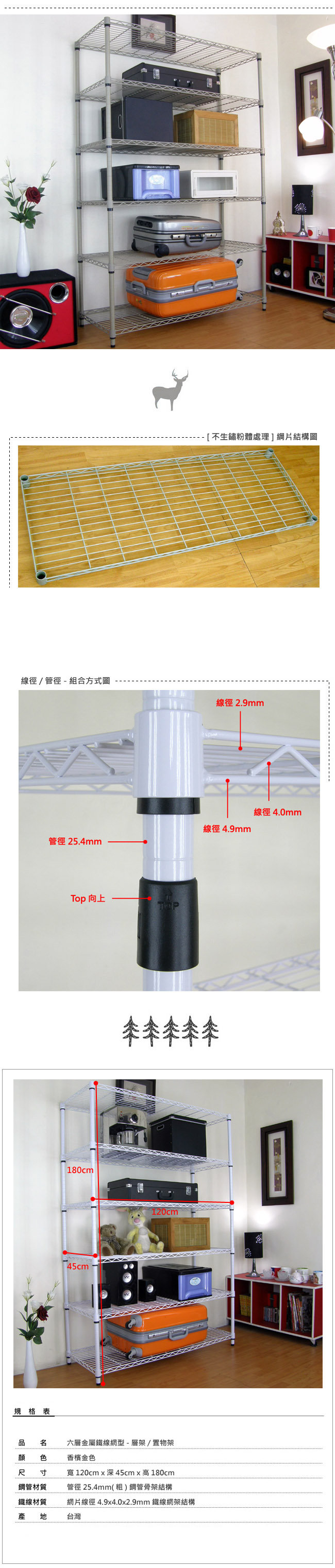 45DX120WX180H公分-六層金屬鐵線網架/置物架-香檳金[不生鏽粉體處理] ◆六層金屬[鐵線]網架-置物架,每層平圴承重力約100公斤(整組平圴承重力約600公斤)。 ◆100%台灣製造,結構簡單、組合方便,拆裝容易,不傷網架本體,再次使用品質不變。 ◆本商品表面為香檳金[不生鏽粉體處理],網架完全可DIY組裝,結構簡單、拆組容易。 ◆每片金屬[鐵線]網架高度,可依需求自行調整,要高要低隨心所欲,可依照需求隨時調整。 ◆金屬[鐵線]網架,任何地點皆適用,營業用,工業用,家庭用,店面,倉儲,住家,搭配性強。 ◆鐵線材質:網片線徑4.9x4.0x2.9mm(橫線16條/直線10條)鐵線網架結構,粉體防鏽處理,耐刮、耐磨。 ◆商品尺寸為:120 公分[寬] X 45 公分[深] X 180 公分[高]。 ◆鋼管材質:鋼管管徑25.4mm(粗) 鋼管骨架 結構 。 ◆商品產地:[精品嚴選] 100%台灣製造。 ◆商品屬性:簡單DIY。