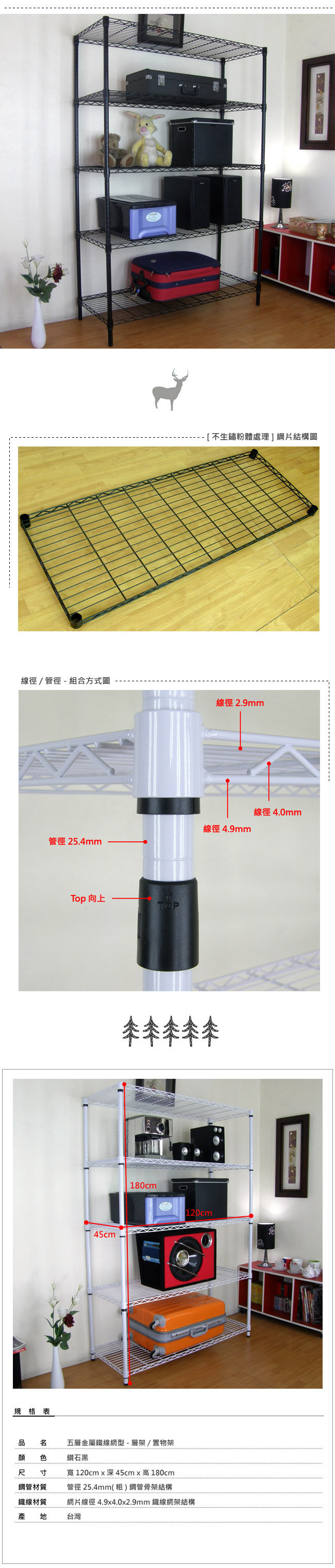 ◆商品品名:45Dx120Wx180H公分-五層金屬鐵線網架/置物架[不生銹粉體處理]