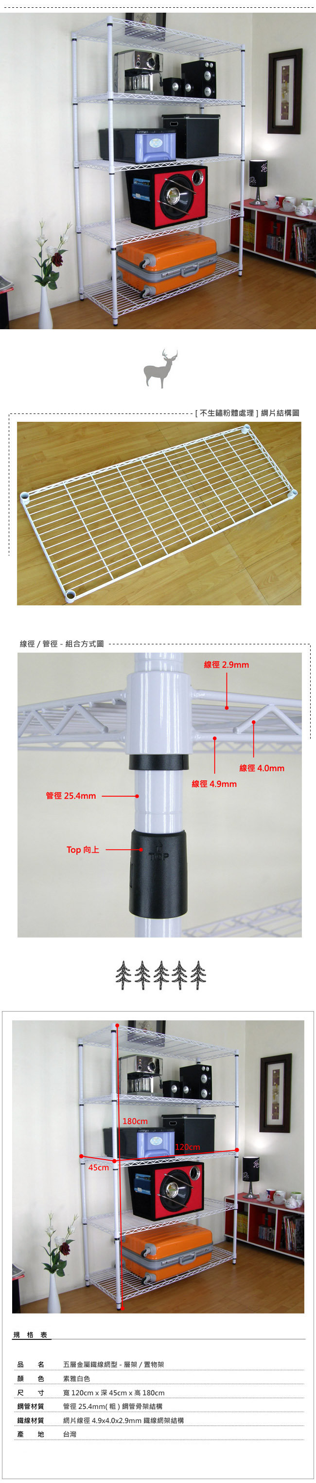 ◆商品品名:45Dx120Wx180H公分-五層金屬鐵線網架/置物架[不生銹粉體處理]