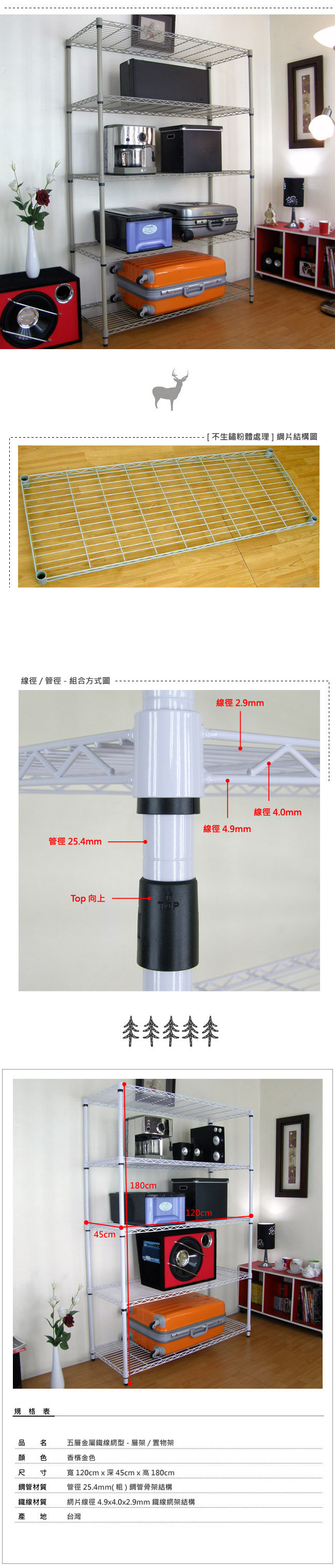 45DX120WX180H公分-五層金屬鐵線網架/置物架-香檳金[不生鏽粉體處理] ◆五層金屬[鐵線]網架-置物架,每層平圴承重力約100公斤(整組平圴承重力約500公斤)。 ◆100%台灣製造,結構簡單、組合方便,拆裝容易,不傷網架本體,再次使用品質不變。 ◆本商品表面為香檳金[不生鏽粉體處理],網架完全可DIY組裝,結構簡單、拆組容易。 ◆每片金屬[鐵線]網架高度,可依需求自行調整,要高要低隨心所欲,可依照需求隨時調整。 ◆金屬[鐵線]網架,任何地點皆適用,營業用,工業用,家庭用,店面,倉儲,住家,搭配性強。 ◆鐵線材質:網片線徑4.9x4.0x2.9mm(橫線16條/直線10條)鐵線網架結構,粉體防鏽處理,耐刮、耐磨。 ◆商品尺寸為:120 公分[寬] X 45 公分[深] X 180 公分[高]。 ◆鋼管材質:鋼管管徑25.4mm(粗) 鋼管骨架 結構 。 ◆商品產地:[精品嚴選] 100%台灣製造。 ◆商品屬性:簡單DIY。
