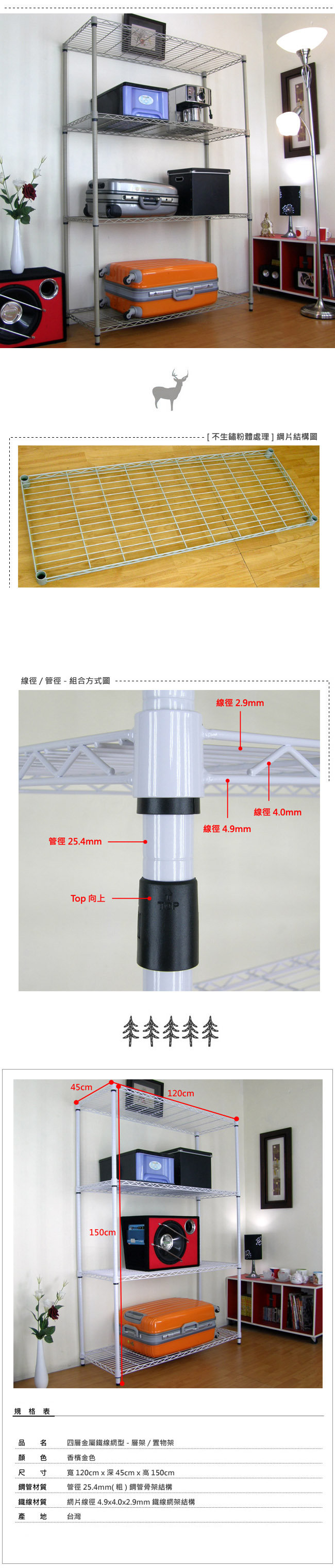 45DX120WX150H公分-四層金屬鐵線網架/置物架-香檳金[不生鏽粉體處理] ◆四層金屬[鐵線]網架-置物架,每層平圴承重力約100公斤(整組平圴承重力約400公斤)。 ◆100%台灣製造,結構簡單、組合方便,拆裝容易,不傷網架本體,再次使用品質不變。 ◆本商品表面為香檳金[不生鏽粉體處理],網架完全可DIY組裝,結構簡單、拆組容易。 ◆每片金屬[鐵線]網架高度,可依需求自行調整,要高要低隨心所欲,可依照需求隨時調整。 ◆金屬[鐵線]網架,任何地點皆適用,營業用,工業用,家庭用,店面,倉儲,住家,搭配性強。 ◆鐵線材質:網片線徑4.9x4.0x2.9mm(橫線16條/直線10條)鐵線網架結構,粉體防鏽處理,耐刮、耐磨。 ◆商品尺寸為:120 公分[寬] X 45 公分[深] X 150 公分[高]。 ◆鋼管材質:鋼管管徑25.4mm(粗) 鋼管骨架 結構 。 ◆商品產地:[精品嚴選] 100%台灣製造。 ◆商品屬性:簡單DIY。