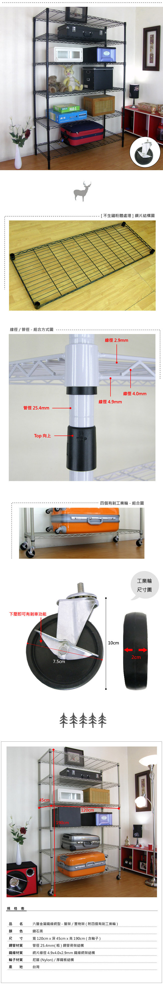 45DX120WX190H公分-六層金屬鐵線網架/置物架(鑽石黑)-附四個(有剎車功能)工業用輪子 ◆六層金屬[鐵線]網架-置物架,每層平圴承重力約100公斤(整組平圴承重力約600公斤)。 ◆100%台灣製造,結構簡單、組合方便,拆裝容易,不傷網架本體,再次使用品質不變。 ◆本商品表面為鑽石黑[不生鏽粉體處理],網架完全可DIY組裝,結構簡單、拆組容易。 ◆每片金屬[鐵線]網架高度,可依需求自行調整,要高要低隨心所欲,可依照需求隨時調整。 ◆金屬[鐵線]網架,任何地點皆適用,營業用,工業用,家庭用,店面,倉儲,住家,搭配性強。 ◆鐵線材質:網片線徑4.9x4.0x2.9mm(橫線16條/直線10條)鐵線網架結構,粉體防鏽處理,耐刮、耐磨。 ◆商品尺寸為:120 公分[寬] X 45 公分[深] X 190 公分[高](含輪子)。 ◆鋼管材質:鋼管管徑25.4mm(粗) 鋼管骨架 結構 。 ◆商品產地:[精品嚴選] 100%台灣製造。 ◆商品屬性:簡單DIY。 輪子特性: ◆本商品為四個[3”英吋]75mm [網架專用]工業用輪子。 ◆本商品輪子材質為尼龍(Nylon) +厚鐵板結構製造而成。 ◆本商尺寸為7.5公分[寬] X 4公分[深] X 10公分[高](簡單DIY)。 ◆四個工業輪的平圴承重力約200公斤(每個輪子皆附有剎車功能)。