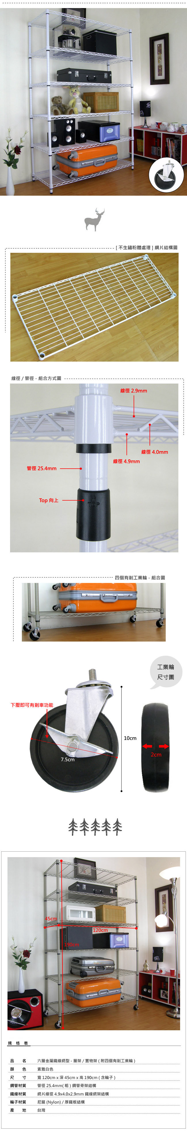 45DX120WX190H公分-六層金屬鐵線網架/置物架(素雅白)-附四個(有剎車功能)工業用輪子 ◆六層金屬[鐵線]網架-置物架,每層平圴承重力約100公斤(整組平圴承重力約600公斤)。 ◆100%台灣製造,結構簡單、組合方便,拆裝容易,不傷網架本體,再次使用品質不變。 ◆本商品表面為素雅白[不生鏽粉體處理],網架完全可DIY組裝,結構簡單、拆組容易。 ◆每片金屬[鐵線]網架高度,可依需求自行調整,要高要低隨心所欲,可依照需求隨時調整。 ◆金屬[鐵線]網架,任何地點皆適用,營業用,工業用,家庭用,店面,倉儲,住家,搭配性強。 ◆鐵線材質:網片線徑4.9x4.0x2.9mm(橫線16條/直線10條)鐵線網架結構,粉體防鏽處理,耐刮、耐磨。 ◆商品尺寸為:120 公分[寬] X 45 公分[深] X 190 公分[高](含輪子)。 ◆鋼管材質:鋼管管徑25.4mm(粗) 鋼管骨架 結構 。 ◆商品產地:[精品嚴選] 100%台灣製造。 ◆商品屬性:簡單DIY。 輪子特性: ◆本商品為四個[3”英吋]75mm [網架專用]工業用輪子。 ◆本商品輪子材質為尼龍(Nylon) +厚鐵板結構製造而成。 ◆本商尺寸為7.5公分[寬] X 4公分[深] X 10公分[高](簡單DIY)。 ◆四個工業輪的平圴承重力約200公斤(每個輪子皆附有剎車功能)。