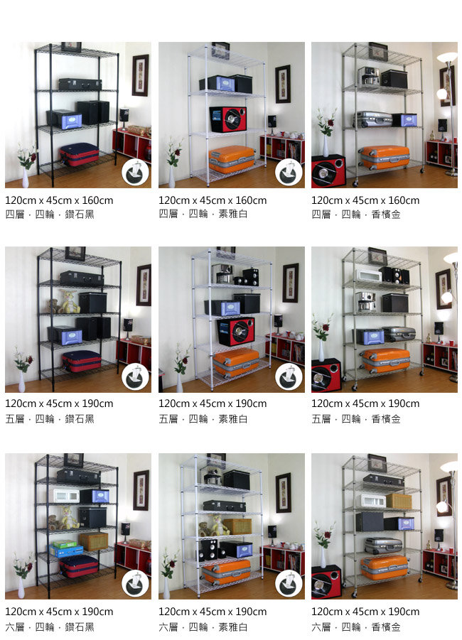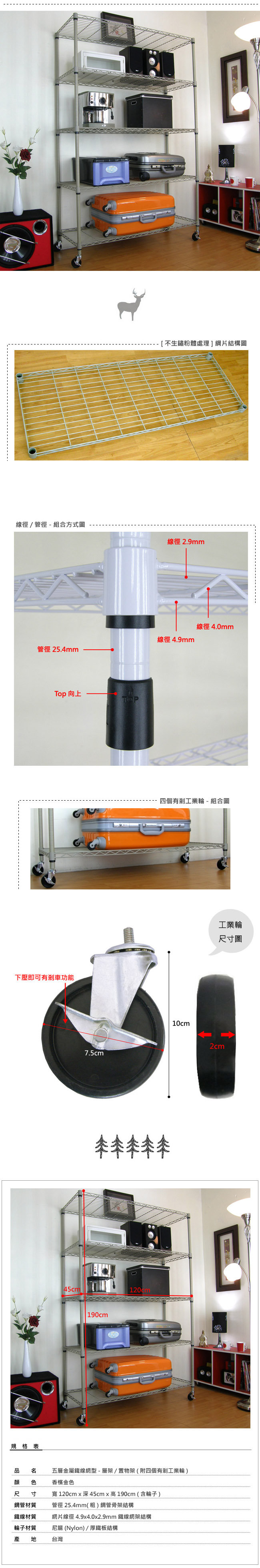 45DX120WX190H公分-五層金屬鐵線網架/置物架(香檳金)-附四個(有剎車功能)工業用輪子 ◆五層金屬[鐵線]網架-置物架,每層平圴承重力約100公斤(整組平圴承重力約500公斤)。 ◆100%台灣製造,結構簡單、組合方便,拆裝容易,不傷網架本體,再次使用品質不變。 ◆本商品表面為香檳金[不生鏽粉體處理],網架完全可DIY組裝,結構簡單、拆組容易。 ◆每片金屬[鐵線]網架高度,可依需求自行調整,要高要低隨心所欲,可依照需求隨時調整。 ◆金屬[鐵線]網架,任何地點皆適用,營業用,工業用,家庭用,店面,倉儲,住家,搭配性強。 ◆鐵線材質:網片線徑4.9x4.0x2.9mm(橫線16條/直線10條)鐵線網架結構,粉體防鏽處理,耐刮、耐磨。 ◆商品尺寸為:120 公分[寬] X 45 公分[深] X 190 公分[高](含輪子)。 ◆鋼管材質:鋼管管徑25.4mm(粗) 鋼管骨架 結構 。 ◆商品產地:[精品嚴選] 100%台灣製造。 ◆商品屬性:簡單DIY。 輪子特性: ◆本商品為四個[3”英吋]75mm [網架專用]工業用輪子。 ◆本商品輪子材質為尼龍(Nylon) +厚鐵板結構製造而成。 ◆本商尺寸為7.5公分[寬] X 4公分[深] X 10公分[高](簡單DIY)。 ◆四個工業輪的平圴承重力約200公斤(每個輪子皆附有剎車功能)。