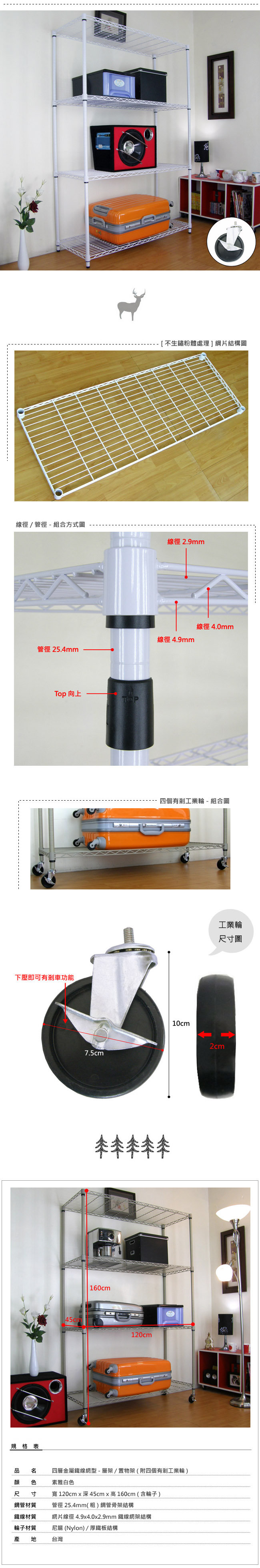 45DX120WX160H公分-四層金屬鐵線網架/置物架(素雅白)-附四個(有剎車功能)工業用輪子 ◆四層金屬[鐵線]網架-置物架,每層平圴承重力約100公斤(整組平圴承重力約400公斤)。 ◆100%台灣製造,結構簡單、組合方便,拆裝容易,不傷網架本體,再次使用品質不變。 ◆本商品表面為素雅白[不生鏽粉體處理],網架完全可DIY組裝,結構簡單、拆組容易。 ◆每片金屬[鐵線]網架高度,可依需求自行調整,要高要低隨心所欲,可依照需求隨時調整。 ◆金屬[鐵線]網架,任何地點皆適用,營業用,工業用,家庭用,店面,倉儲,住家,搭配性強。 ◆鐵線材質:網片線徑4.9x4.0x2.9mm(橫線16條/直線10條)鐵線網架結構,粉體防鏽處理,耐刮、耐磨。 ◆商品尺寸為:120 公分[寬] X 45 公分[深] X 160 公分[高](含輪子)。 ◆鋼管材質:鋼管管徑25.4mm(粗) 鋼管骨架 結構 。 ◆商品產地:[精品嚴選] 100%台灣製造。 ◆商品屬性:簡單DIY。 輪子特性: ◆本商品為四個[3”英吋]75mm [網架專用]工業用輪子。 ◆本商品輪子材質為尼龍(Nylon) +厚鐵板結構製造而成。 ◆本商尺寸為7.5公分[寬] X 4公分[深] X 10公分[高](簡單DIY)。 ◆四個工業輪的平圴承重力約200公斤(每個輪子皆附有剎車功能)。