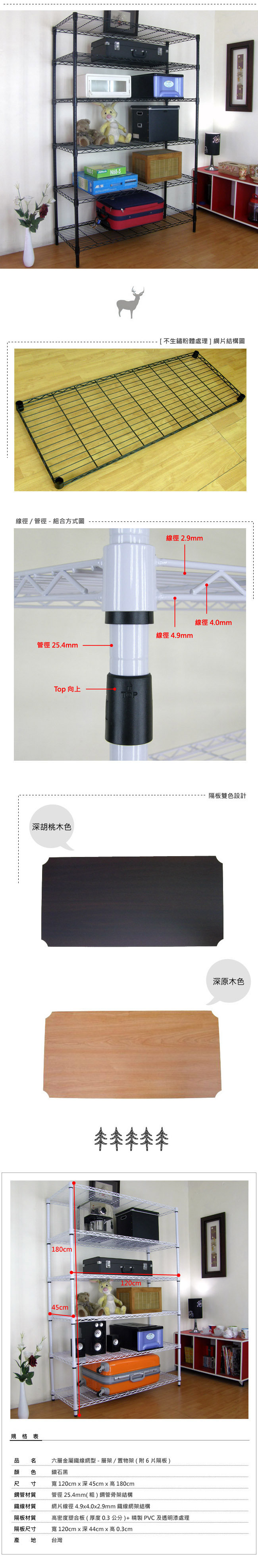 45DX120WX180H公分-六層金屬鐵線網架/置物架-鑽石黑[不生鏽粉體處理]-附6片隔板 ◆六層金屬[鐵線]網架/置物架,每層平圴承重力約100公斤(整組平圴承重力約600公斤)。 ◆100%台灣製造,結構簡單、組合方便,拆裝容易,不傷網架本體,再次使用品質不變。 ◆商品表面為鑽石黑[不生鏽材質粉體處理],網架完全可DIY組裝,結構簡單、拆組容易。 ◆每片金屬[鐵線]網架高度,可依需求自行調整,要高要低隨心所欲,可依照需求隨時調整。 ◆金屬[鐵線]網架,任何地點皆適用,營業用,工業用,家庭用,店面,倉儲,住家,搭配性強。 ◆鐵線材質:網片線徑4.9x4.0x2.9mm(橫線16條/直線10條)鐵線網架結構,粉體防鏽處理,耐刮、耐磨。 ◆商品尺寸為:120 公分(寬) x 45 公分(深) x 180 公分(高)。 ◆鋼管材質:鋼管管徑25.4mm(粗) 鋼管骨架 結構。 ◆商品產地:[精品嚴選] 100%台灣製造。 ◆商品屬性:簡單DIY。 鐵線網架專用"置物隔板"-雙色設計 ◆"置物隔板"為雙色設計,正面為深胡桃木色及背面為深原木色,可依喜歡顏色選擇使用。 ◆每片"置物隔板"厚度為3mm堅固耐用,置物隔板空間,可放置任何小物品。 ◆隔板材質:高密度塑合板(厚度0.3公分)+精製PVC及透明漆處理。 ◆隔板顏色:如圖 / 雙色設計=深胡桃木色 及 深原木色。 ◆隔板尺寸:120 公分(寬) x 44 公分(深) x 0.3 公分(高)。 ◆組裝方式:只要輕輕放上網片上即可完成。