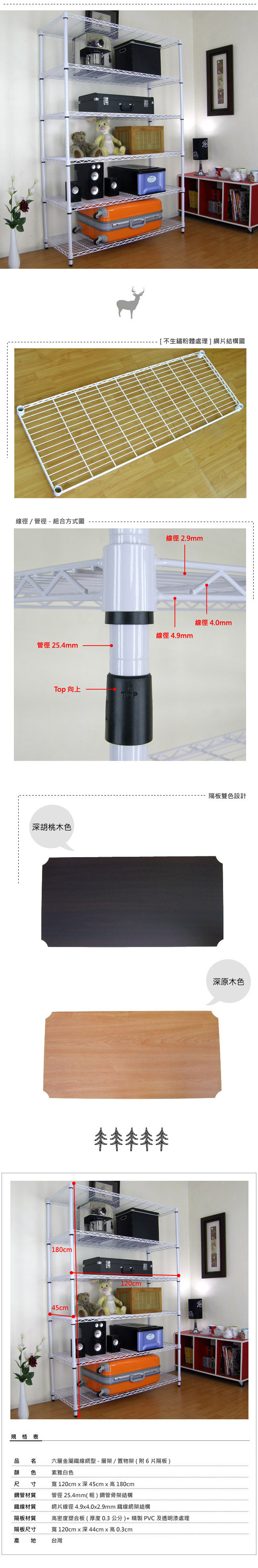 45DX120WX180H公分-六層金屬鐵線網架/置物架-素雅白[不生鏽粉體處理]-附6片隔板 ◆六層金屬[鐵線]網架/置物架,每層平圴承重力約100公斤(整組平圴承重力約600公斤)。 ◆100%台灣製造,結構簡單、組合方便,拆裝容易,不傷網架本體,再次使用品質不變。 ◆商品表面為素雅白[不生鏽材質粉體處理],網架完全可DIY組裝,結構簡單、拆組容易。 ◆每片金屬[鐵線]網架高度,可依需求自行調整,要高要低隨心所欲,可依照需求隨時調整。 ◆金屬[鐵線]網架,任何地點皆適用,營業用,工業用,家庭用,店面,倉儲,住家,搭配性強。 ◆鐵線材質:網片線徑4.9x4.0x2.9mm(橫線16條/直線10條)鐵線網架結構,粉體防鏽處理,耐刮、耐磨。 ◆商品尺寸為:120 公分(寬) x 45 公分(深) x 180 公分(高)。 ◆鋼管材質:鋼管管徑25.4mm(粗) 鋼管骨架 結構。 ◆商品產地:[精品嚴選] 100%台灣製造。 ◆商品屬性:簡單DIY。 鐵線網架專用"置物隔板"-雙色設計 ◆"置物隔板"為雙色設計,正面為深胡桃木色及背面為深原木色,可依喜歡顏色選擇使用。 ◆每片"置物隔板"厚度為3mm堅固耐用,置物隔板空間,可放置任何小物品。 ◆隔板材質:高密度塑合板(厚度0.3公分)+精製PVC及透明漆處理。 ◆隔板顏色:如圖 / 雙色設計=深胡桃木色 及 深原木色。 ◆隔板尺寸:120 公分(寬) x 44 公分(深) x 0.3 公分(高)。 ◆組裝方式:只要輕輕放上網片上即可完成。