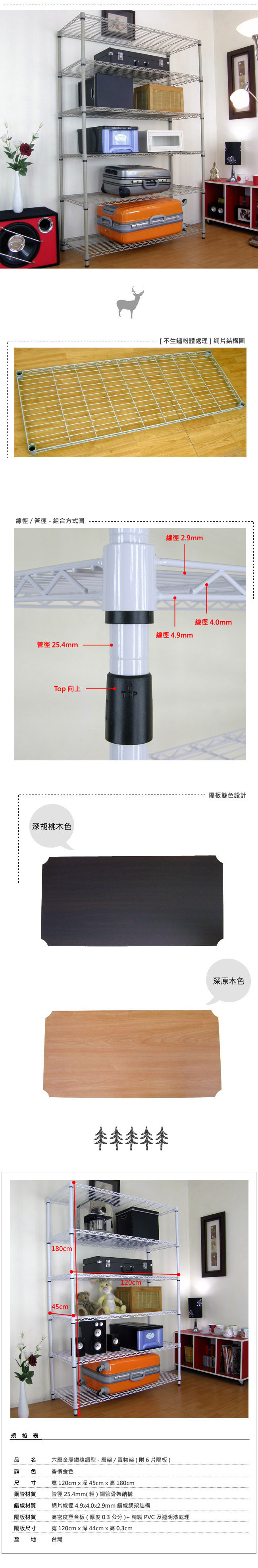 45DX120WX180H公分-六層金屬鐵線網架/置物架-香檳金[不生鏽粉體處理]-附6片隔板 ◆六層金屬[鐵線]網架/置物架,每層平圴承重力約100公斤(整組平圴承重力約600公斤)。 ◆100%台灣製造,結構簡單、組合方便,拆裝容易,不傷網架本體,再次使用品質不變。 ◆商品表面為香檳金[不生鏽材質粉體處理],網架完全可DIY組裝,結構簡單、拆組容易。 ◆每片金屬[鐵線]網架高度,可依需求自行調整,要高要低隨心所欲,可依照需求隨時調整。 ◆金屬[鐵線]網架,任何地點皆適用,營業用,工業用,家庭用,店面,倉儲,住家,搭配性強。 ◆鐵線材質:網片線徑4.9x4.0x2.9mm(橫線16條/直線10條)鐵線網架結構,粉體防鏽處理,耐刮、耐磨。 ◆商品尺寸為:120 公分(寬) x 45 公分(深) x 180 公分(高)。 ◆鋼管材質:鋼管管徑25.4mm(粗) 鋼管骨架 結構。 ◆商品產地:[精品嚴選] 100%台灣製造。 ◆商品屬性:簡單DIY。 鐵線網架專用"置物隔板"-雙色設計 ◆"置物隔板"為雙色設計,正面為深胡桃木色及背面為深原木色,可依喜歡顏色選擇使用。 ◆每片"置物隔板"厚度為3mm堅固耐用,置物隔板空間,可放置任何小物品。 ◆隔板材質:高密度塑合板(厚度0.3公分)+精製PVC及透明漆處理。 ◆隔板顏色:如圖 / 雙色設計=深胡桃木色 及 深原木色。 ◆隔板尺寸:120 公分(寬) x 44 公分(深) x 0.3 公分(高)。 ◆組裝方式:只要輕輕放上網片上即可完成。