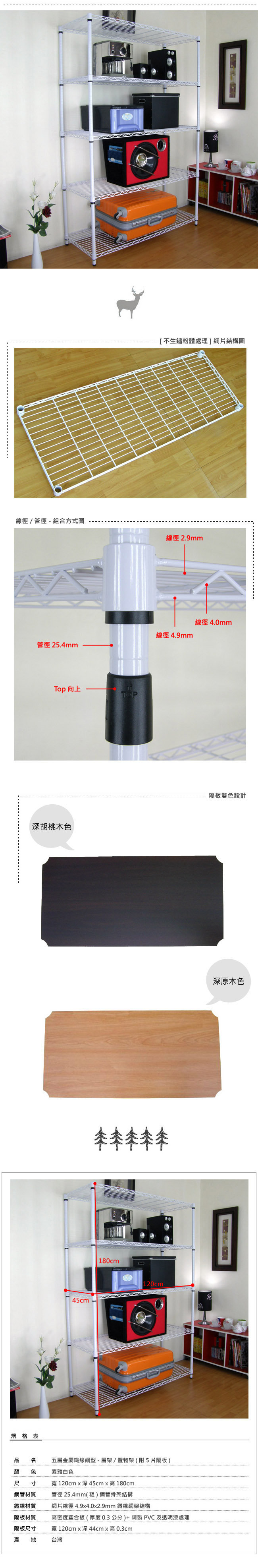 ◆商品品名:45DX120WX180H公分-五層金屬鐵線網架/置物架[不生鏽粉體處理]附5片隔板