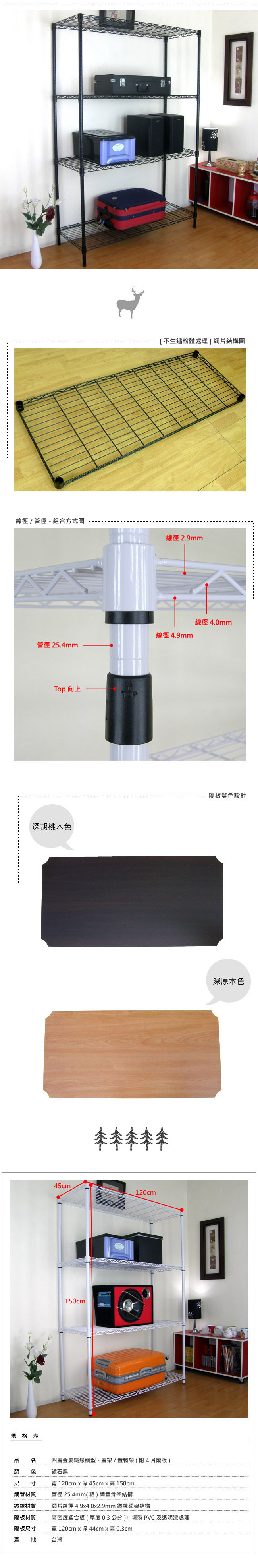 45DX120WX150H公分-四層金屬鐵線網架/置物架-鑽石黑[不生鏽粉體處理]-附4片隔板 ◆四層金屬[鐵線]網架/置物架,每層平圴承重力約100公斤(整組平圴承重力約400公斤)。 ◆100%台灣製造,結構簡單、組合方便,拆裝容易,不傷網架本體,再次使用品質不變。 ◆商品表面為鑽石黑[不生鏽材質粉體處理],網架完全可DIY組裝,結構簡單、拆組容易。 ◆每片金屬[鐵線]網架高度,可依需求自行調整,要高要低隨心所欲,可依照需求隨時調整。 ◆金屬[鐵線]網架,任何地點皆適用,營業用,工業用,家庭用,店面,倉儲,住家,搭配性強。 ◆鐵線材質:網片線徑4.9x4.0x2.9mm(橫線16條/直線10條)鐵線網架結構,粉體防鏽處理,耐刮、耐磨。 ◆商品尺寸為:120 公分(寬) x 45 公分(深) x 150 公分(高)。 ◆鋼管材質:鋼管管徑25.4mm(粗) 鋼管骨架 結構。 ◆商品產地:[精品嚴選] 100%台灣製造。 ◆商品屬性:簡單DIY。 鐵線網架專用"置物隔板"-雙色設計 ◆"置物隔板"為雙色設計,正面為深胡桃木色及背面為深原木色,可依喜歡顏色選擇使用。 ◆每片"置物隔板"厚度為3mm堅固耐用,置物隔板空間,可放置任何小物品。 ◆隔板材質:高密度塑合板(厚度0.3公分)+精製PVC及透明漆處理。 ◆隔板顏色:如圖 / 雙色設計=深胡桃木色 及 深原木色。 ◆隔板尺寸:120 公分(寬) x 44 公分(深) x 0.3 公分(高)。 ◆組裝方式:只要輕輕放上網片上即可完成。