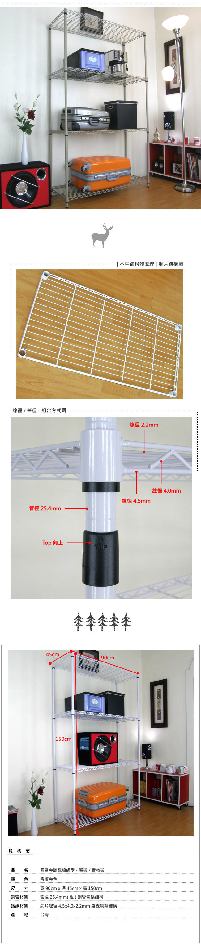 45公分X90公分X150公分-四層金屬鐵線網架/置物架-香檳金[不生鏽粉體處理] ◆四層金屬[鐵線]網架-置物架,每層平圴承重力約100公斤(整組平圴承重力約400公斤)。 ◆100%台灣製造,結構簡單、組合方便,拆裝容易,不傷網架本體,再次使用品質不變。 ◆本商品表面為香檳金[不生鏽粉體處理],網架完全可DIY組裝,結構簡單、拆組容易。 ◆每片金屬[鐵線]網架高度,可依需求自行調整,要高要低隨心所欲,可依照需求隨時調整。 ◆金屬[鐵線]網架,任何地點皆適用,營業用,工業用,家庭用,店面,倉儲,住家,搭配性強。 ◆鐵線材質:網片線徑4.5x4.0x2.2mm(橫線16條/直線6條)鐵線網架 結構,粉體防鏽處理,耐刮、耐磨。 ◆商品為尺寸為90 公分[寬] X 45 公分[深] X 150 公分[高]。 ◆鋼管材質:鋼管管徑25.4mm(粗) 鋼管骨架 結構 。 ◆商品產地:[精品嚴選] 100%台灣製造。 ◆商品屬性:簡單DIY。